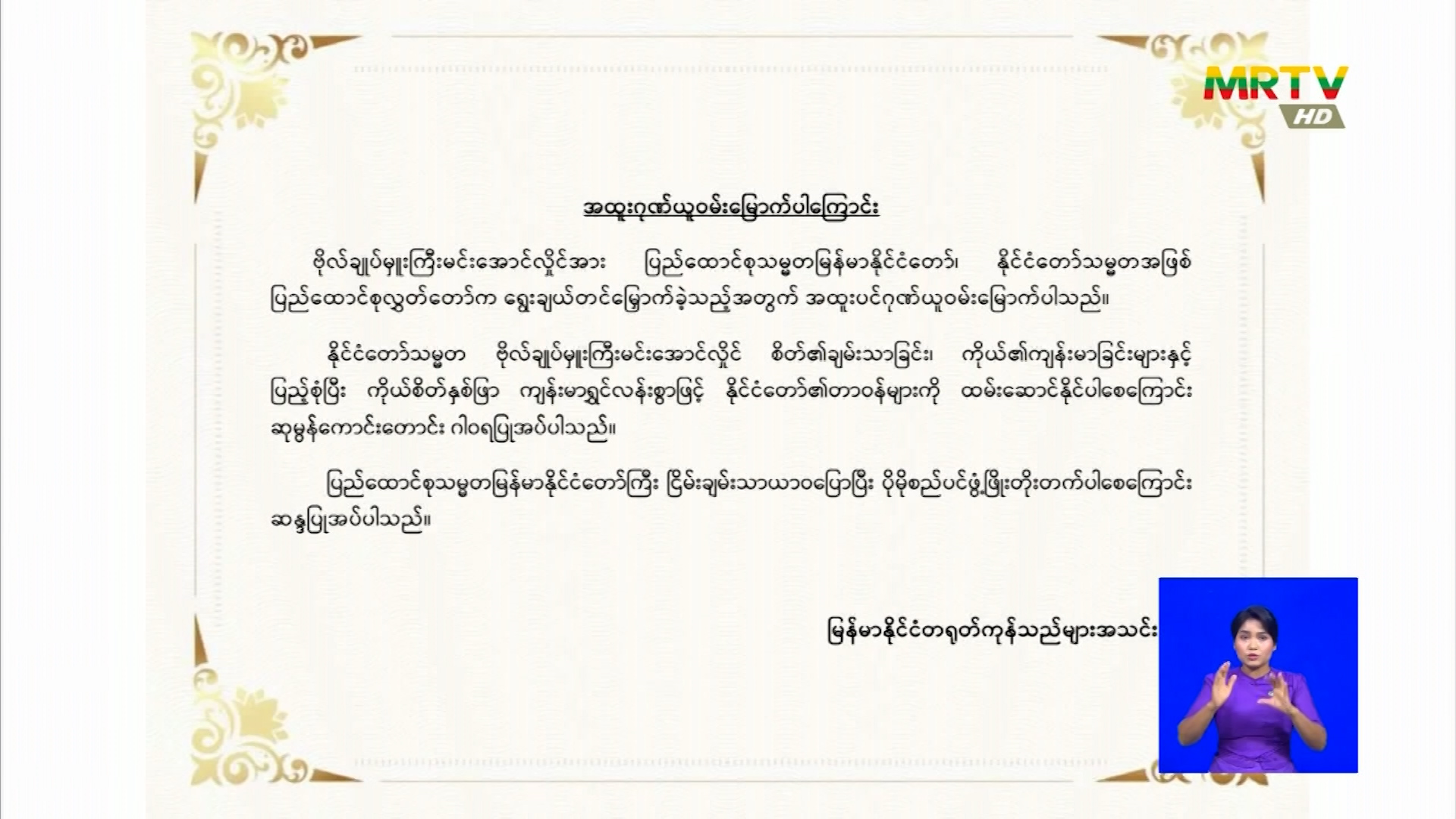 ဗိုလ်ချုပ်မှူးကြီး မင်းအောင်လှိုင် အား နိုင်ငံတော်သမ္မတအဖြစ် ရွေးချယ်တင်မြှောက်ခြင်း ခံရသည့်အတွက် အသင်း/အဖွဲ့များက အထူးဂုဏ်ယူဝမ်းမြောက်ကြောင်း ထုတ်ပြန်ကြေညာ (မျိုးဆက်သစ်ဝံသာနုပါတီ၊ မြန်မာနိုင်ငံ ဟုတ်ကြန့်တရုတ်မျိုးနွယ်အသင်းချုပ်၊ မြန်မာပြည်ဖွား တရုတ်ကုသိုလ်ဖြစ်အသင်း၊ မြန်မာနိုင်ငံ တရုတ်ကုန်သည်များ အသင်းချုပ်၊ မြန်မာနိုင်ငံဆိုင်ရာ ဝန်းကျိုးကုန်သည်ကြီးများ အသင်းချုပ် (Myanmar Wenzhou General Chamber of Commerce)၊ မြန်မာနိုင်ငံဆိုင်ရာ အန့်ဟွေး ကုန်သည်ကြီးများအသင်း၊ ရန်ကုန်ယူနန် လူမှုကူညီရေးအသင်း၊ ကောင်းတုံကုန်သည်နှင့် လုပ်ငန်းရှင်များအသင်း၊ မြန်မာ-အိန္ဒိယ ချစ်ကြည်ရေးအသင်း၊ မြန်မာ-အိန္ဒိယ အပြည်ပြည်ဆိုင်ရာ စီးပွားရေးလုပ်ငန်းရှင်များအသင်းချုပ် (MIBF)၊ မြန်မာ-ဂျပန် လူမှုစီးပွားဖွံ့ဖြိုးတိုးတက်ရေး ပူးပေါင်းဆောင်ရွက်မှုအသင်း၊ မြန်မာနိုင်ငံဆေးကောင်စီ၊ မြန်မာနိုင်ငံ မိခင်နှင့်ကလေး စောင့်ရှောက်ရေးအသင်း၊ မြန်မာနိုင်ငံတိုင်းရင်းဆေးကောင်စီ၊ မြန်မာနိုင်ငံသွားနှင့်ခံတွင်းဆိုင်ရာ ဆေးကောင်စီ၊ မြန်မာနိုင်ငံ ပုဂ္ဂလိကဆေးရုံများအသင်း၊ မြန်မာနိုင်ငံ ဆေးနှင့်ဆေးပစ္စည်း ထုတ်လုပ်သူများအသင်း၊ မြန်မာနိုင်ငံ တိုင်းရင်းဆေးဝါး ထုတ်လုပ်သူများနှင့် ဆေးပစ္စည်းလုပ်ငန်းရှင်များအသင်း၊ မြန်မာနိုင်ငံသူနာပြုနှင့် သားဖွားကောင်စီ၊ မြန်မာနိုင်ငံကြက်ခြေနီအသင်း၊ မြန်မာနိုင်ငံ ဆေးနှင့်ဆေးပစ္စည်း လုပ်ငန်းရှင်များအသင်း၊ မြန်မာနိုင်ငံ ဆေးပညာရှင်အဖွဲ့၊ မြန်မာနိုင်ငံ သတင်းမီဒီယာကောင်စီ၊ ဘာသာပေါင်းစုံ ချစ်ကြည်ညီညွတ်ရေးအဖွဲ့(ဗဟို)၊ မြန်မာနိုင်ငံရုပ်ရှင်အစည်းအရုံး၊ ပြည်ထောင်စုသမ္မတမြန်မာနိုင်ငံ ကုန်သည်များနှင့် စက်မှုလက်မှုလုပ်ငန်းရှင်များ အသင်းချုပ်၊ မြန်မာနိုင်ငံလုံးဆိုင်ရာ အစ္စလာမ်ဘာသာရေးအဖွဲ့ကြီး)