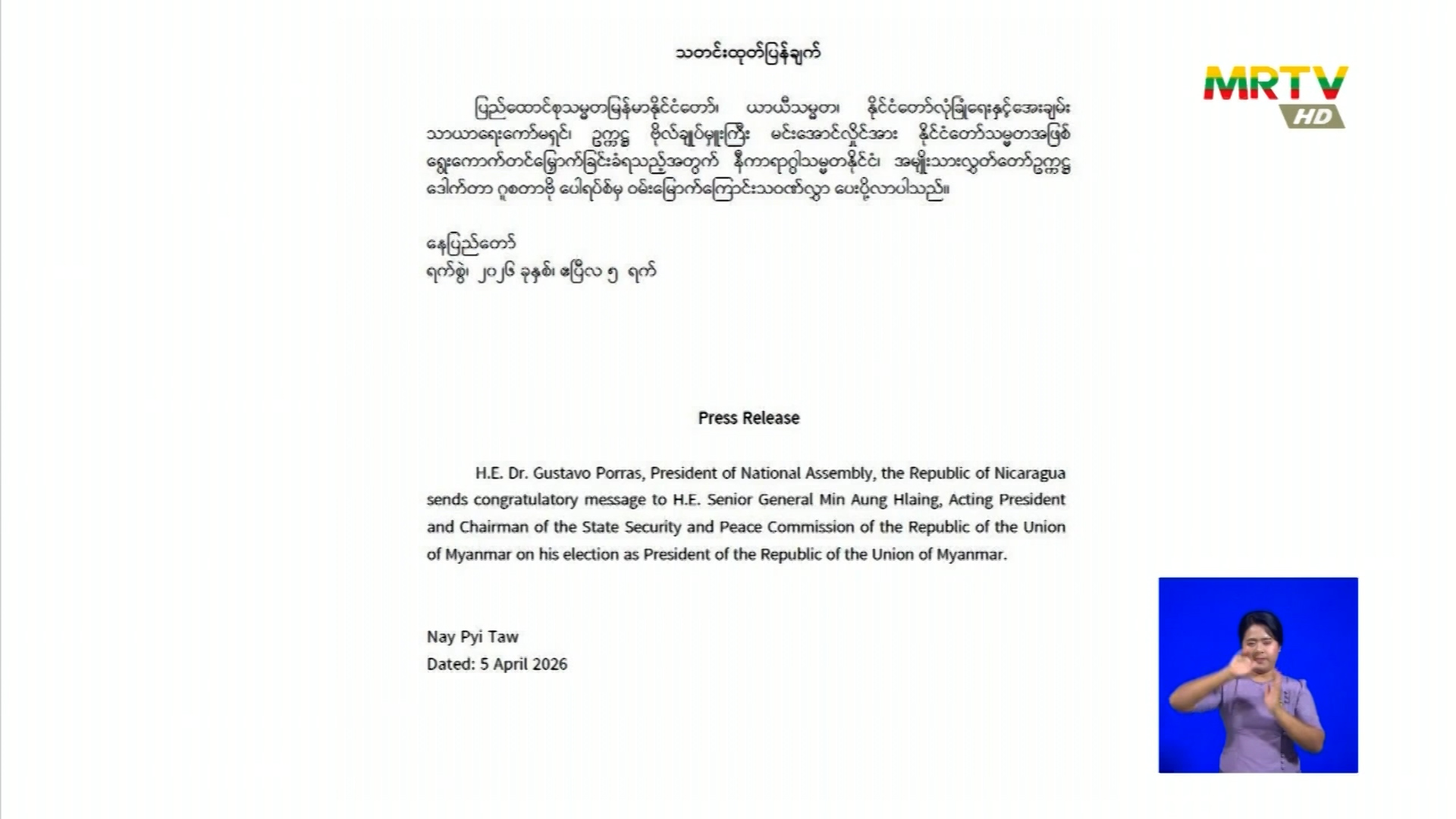ပြည်ထောင်စုသမ္မတမြန်မာနိုင်ငံတော်၊ ယာယီသမ္မတ၊ နိုင်ငံတော်လုံခြုံရေးနှင့် အေးချမ်းသာယာရေးကော်ရှင်ဥက္ကဋ္ဌ ဗိုလ်ချုပ်မှူးကြီးမင်းအောင်လှိုင် အား နိုင်ငံတော်သမ္မတအဖြစ် ရွေးကောက်တင်မြှောက်ခြင်းခံရသည့်အတွက် နီကာရာဂွါသမ္မတနိုင်ငံ၊ အမျိုးသားလွှတ်တော်ဥက္ကဋ္ဌ ဒေါက်တာ ဂူစတာဗို ပေါရပ်စ် ထံမှ ဝမ်းမြောက်ကြောင်း သဝဏ်လွှာပေးပို့