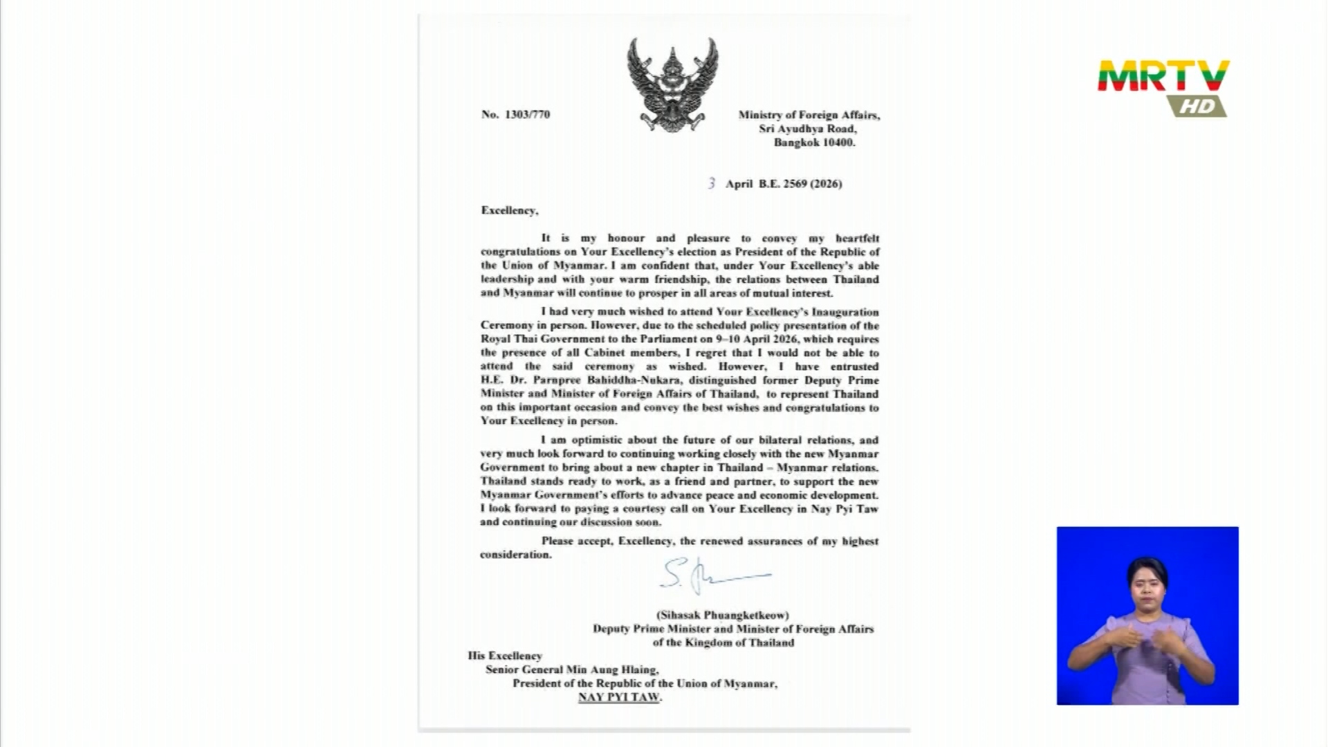 ပြည်ထောင်စုသမ္မတမြန်မာနိုင်ငံတော်၊ ယာယီသမ္မတ၊ နိုင်ငံတော်လုံခြုံရေးနှင့် အေးချမ်းသာယာရေးကော်ရှင်ဥက္ကဋ္ဌ ဗိုလ်ချုပ်မှူးကြီးမင်းအောင်လှိုင် အား နိုင်ငံတော်သမ္မတအဖြစ် ရွေးကောက်တင်မြှောက်ခြင်းခံရသည့်အတွက် ထိုင်းနိုင်ငံ ဒုတိယဝန်ကြီးချုပ်နှင့် နိုင်ငံခြားရေးဝန်ကြီး Sihasak Phuangketkeow တို့ ထံမှ ဝမ်းမြောက်ကြောင်း သဝဏ်လွှာပေးပို့