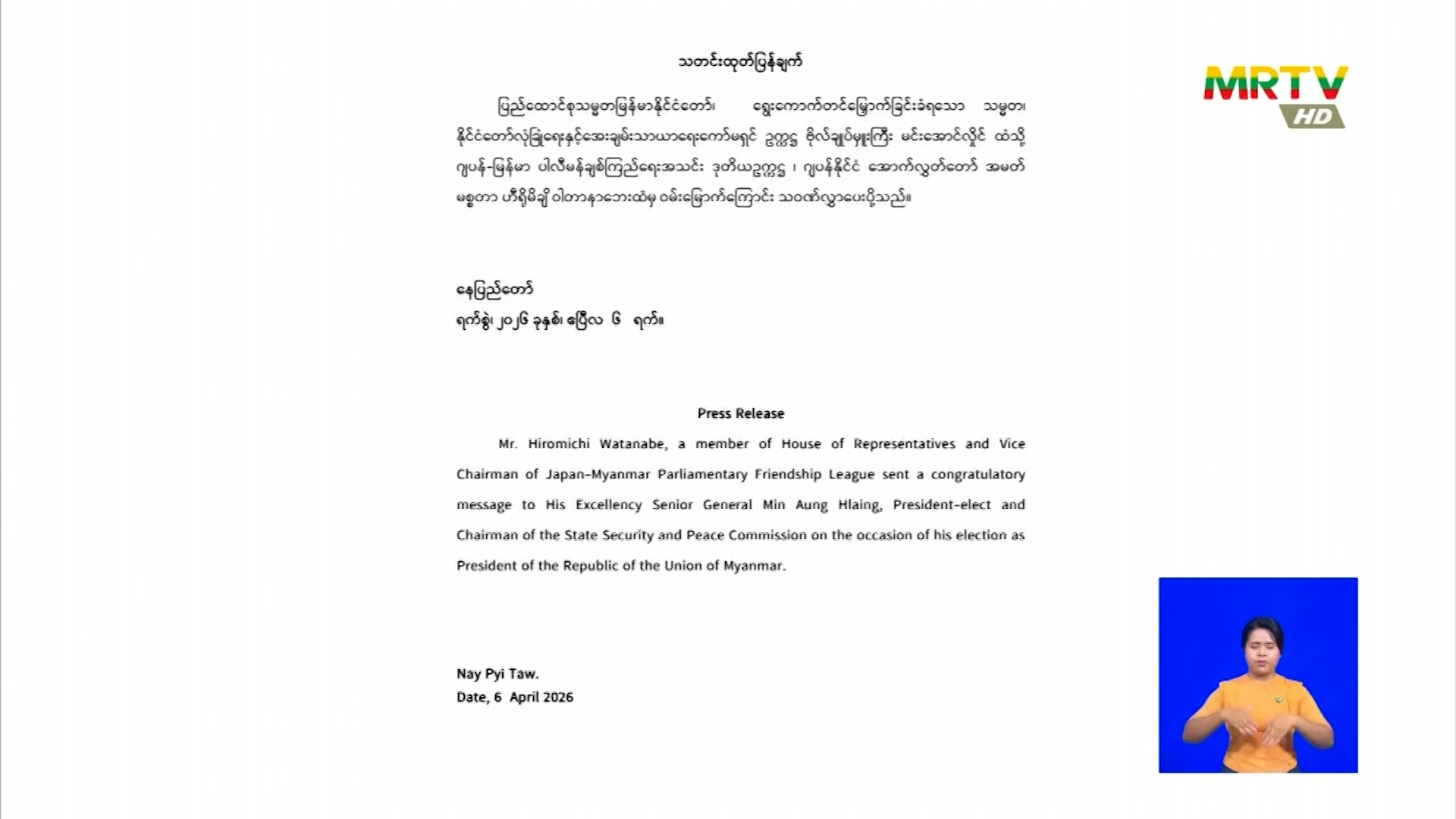 ပြည်ထောင်စုသမ္မတမြန်မာနိုင်ငံတော်၊ ရွေးကောက်တင်မြှောက်ခြင်းခံရသောသမ္မတ နိုင်ငံတော်လုံခြုံရေးနှင့် အေးချမ်းသာယာရေးကော်မရှင် ဥက္ကဋ္ဌ ဗိုလ်ချုပ်မှူးကြီး မင်းအောင်လှိုင် ထံသို့ ဂျပန်-မြန်မာ ပါလီမန်ချစ်ကြည်ရေးအသင်း ဒုတိယဥက္ကဋ္ဌ၊ ဂျပန်နိုင်ငံ အောက်လွှတ်တော် အမတ် မစ္စတာ ဟီရိုမိချိ ဝါတာနာဘေး ထံမှ ဝမ်းမြောက်ကြောင်း သဝဏ်လွှာပေးပို့