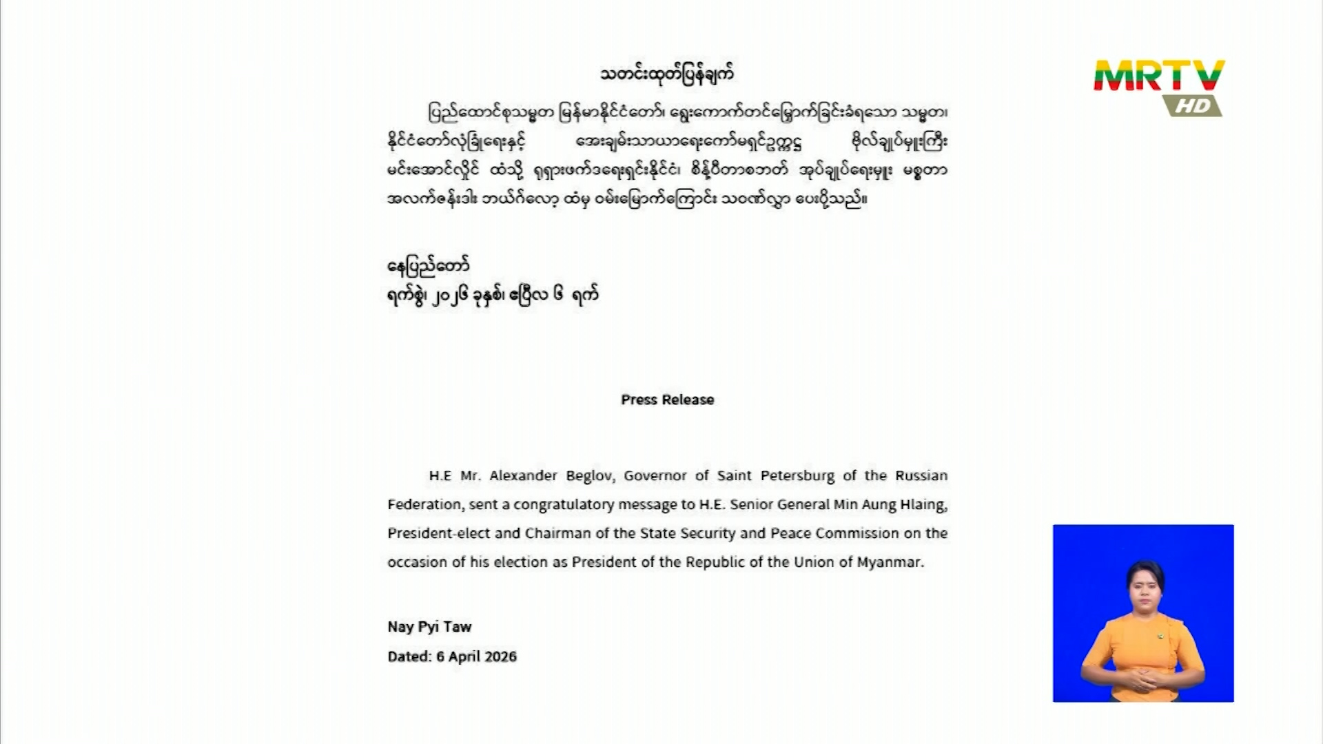ပြည်ထောင်စုသမ္မတမြန်မာနိုင်ငံတော်၊ ရွေးကောက်တင်မြှောက်ခြင်းခံရသောသမ္မတ နိုင်ငံတော်လုံခြုံရေးနှင့် အေးချမ်းသာယာရေးကော်မရှင် ဥက္ကဋ္ဌ ဗိုလ်ချုပ်မှူးကြီး မင်းအောင်လှိုင် ထံသို့ ရုရှားဖက်ဒရေးရှင်းနိုင်ငံ၊ စိန့်ပီတာ စဘတ် အုပ်ချုပ်ရေးမှူး မစ္စတာ အလက်ဇန်းဒါး ဘယ်ဂ်လော့ ထံမှ ဝမ်းမြောက်ကြောင်း သဝဏ်လွှာပေးပို့ Monday, April 06, 2026