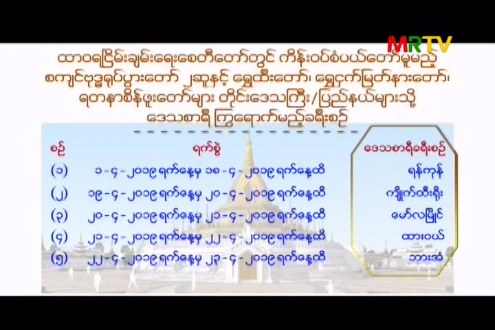 ထာဝရငြိမ်းချမ်းရေးစေတီတော်တွင် ကိန်းဝပ်စံပယ်တော်မူမည့် စကျင်ဗုဒ္ဓရုပ်ပွားတော် (၂)ဆူနှင့် ရွှေထီးတော်၊ ရွှေငှက်မြတ်နားတော်၊ ရတနာစိန်ဖူးတော်များ တိုင်းဒေသကြီးပြည်နယ်များသို့ ဒေသစာရီ ကြွရောက်မည့်ခရီးစဉ် Thursday, April 18, 2019 Thursday, April 18, 2019