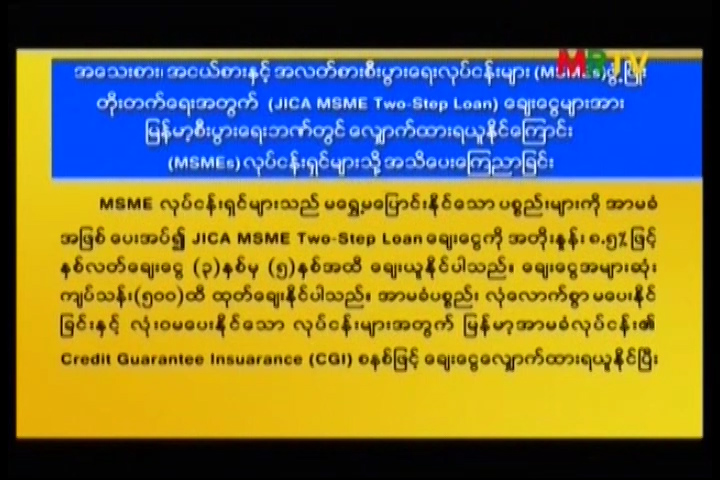 အသေးစား၊ အငယ်စားနှင့် အလတ်စားစီးပွားရေးလုပ်ငန်းများ (MSMs) တိုးတက်ရေးအတွက် (JICA MSME Two Stop Loan) ချေးငွေများအား မြန်မာ့စီးပွားရေးဘဏ်တွင် လျှောက်ထားရယူနိုင်ကြောင်း (MSMEs)လုပ်ငန်းရှင်များသို့အသိပေးခြင်း Thursday, May 09, 2019 Thursday, May 09, 2019
