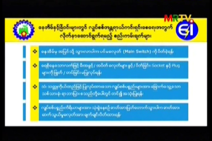နေအိမ်နှင့်ခြံဝန်းများတွင် လျှပ်စစ်အန္တရာယ်ကင်းရှင်းစေရေးအတွက် လိုက်နာဆောင်ရွက်ရမည့် စည်းကမ်းချက်များ Thursday, June 06, 2019 Thursday, June 06, 2019