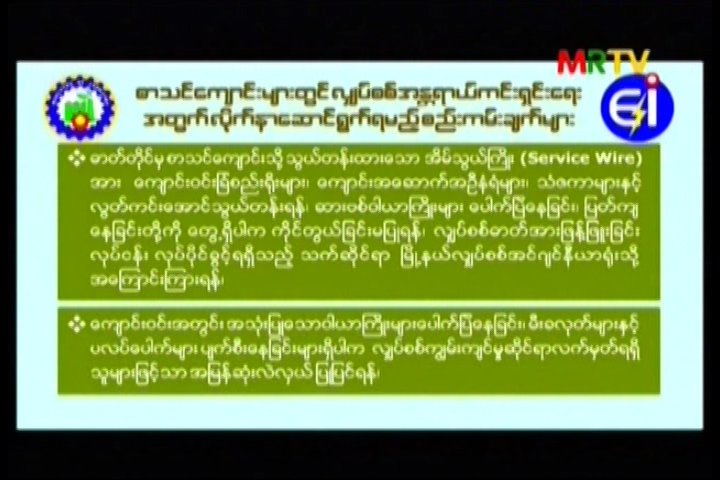 စာသင်ကျောင်းများတွင် လျှပ်စစ်အန္တရာယ်ကင်းရှင်းရေးအတွက် လိုက်နာဆောင်ရွက်ရမည့်စည်းကမ်းချက်များ Sunday, June 09, 2019 Sunday, June 09, 2019