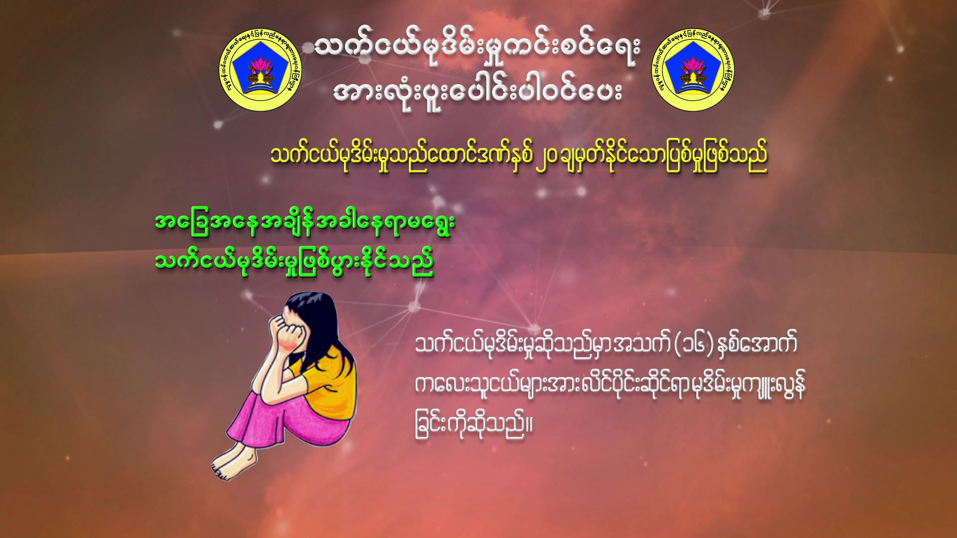 သက်ငယ်မုဒိမ်းမှုကင်းစင်ရေး အားလုံးပူးပေါင်းပါဝင်ပေး Wednesday, July 03, 2019 Wednesday, July 03, 2019