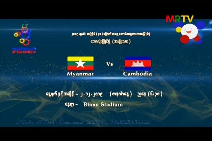 ၂၀၁၉ခုနှစ် အကြိမ်(၃၀)မြောက် အရှေ့တောင်အာရှအားကစားပြိုင်ပွဲ (ဘောလုံးပြိုင်ပွဲ-အမျိုးသားပွဲစဉ်) မြန်မာအသင်းနှင့် ကမ္ဘောဒီးယား အသင်းတို့၏ ယှဉ်ပြိုင်ကစားကြပုံများကို (၂-၁၂-၂၀၁၉)ရက်၊ တနင်္လာနေ့၊ ညနေ( ၆:၃၀)နာရီတွင် MRTV မှ တိုက်ရိုက်ထုတ်လွှင့်မည် Sunday, December 01, 2019 Sunday, December 01, 2019