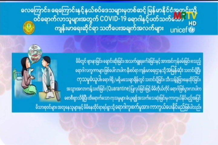 လေကြောင်း၊ ရေကြောင်းနှင့် နယ်စပ်ဒေသများမှတစ်ဆင့် မြန်မာနိုင်ငံအတွင်းသို့၀င်ရောက်လာသူများအတွက် COVID-19 ရောဂါနှင့်ပတ်သက်သော ကျန်းမာရေးဆိုင်ရာသတိပေးအချက်အလက်များ Friday, March 27, 2020 Friday, March 27, 2020