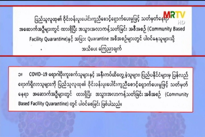 ပြည်သူလူထု၏ ဝိုင်းဝန်းပူးပေါင်းကူညီစောင့်ရှောက်ပေးမှုဖြင့် သတ်မှတ်နေရာ အဆောက်အဦများတွင် ထားရှိပြီး အသွားအလာကန့်သတ်ခြင်း အစီအစဉ် (Community Based Facility Quarantine)နှင့် အခြား Quarantine အစီအစဉ်များတွင် ပါဝင်နေသူများသို့ အသိပေး ကြေညာချက် Thursday, April 09, 2020 Thursday, April 09, 2020