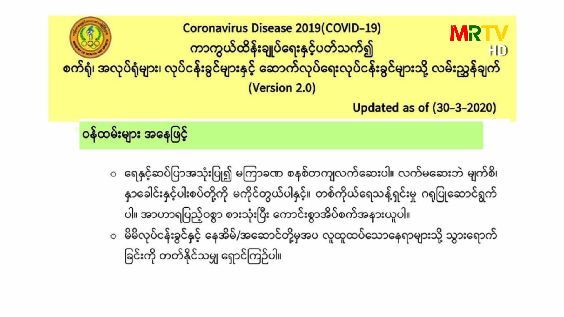 (အနောက်ပိုးကရင် ဘာသာ)Coronavirus Disease 2019 (COVID – 19) ကာကွယ်ထိန်းချုပ်ရေးနှင့် ပတ်သက်၍ စက်ရုံ၊ အလုပ်ရုံများ၊ လုပ်ငန်းခွင်များနှင့် ဆောက်လုပ်ရေးလုပ်ငန်းခွင်များသို့ လမ်းညွှန်ချက် (Version – 2.0) Wednesday, April 15, 2020 Wednesday, April 15, 2020