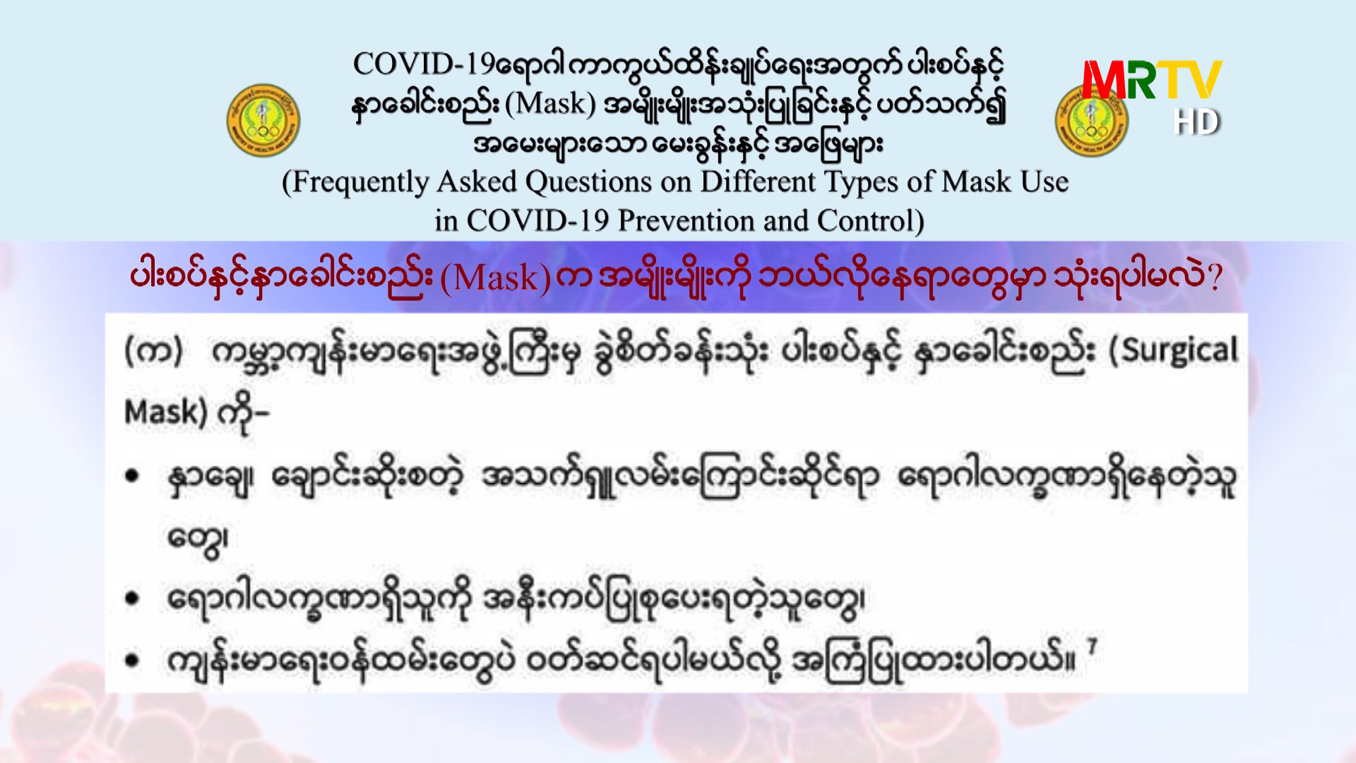 (ရှမ်း ဘာသာ) “COVID – 19 ရောဂါ ကာကွယ်ထိန်းချုပ်ရေးအတွက် ပါးစပ်နှင့် နှာခေါင်းစည်း (Mask) အမျိုးမျိုးအသုံးပြုခြင်းနှင့်ပတ်သက်၍ အမေးများသော မေးခွန်းနှင့် အဖြေများ” (ပါးစပ်နှင့်နှာခေါင်းစည်း (Mask) က အမျိုးမျိုးကို ဘယ်လိုနေရာတွေမှာ သုံးရပါမလဲ) Sunday, April 19, 2020 Sunday, April 19, 2020