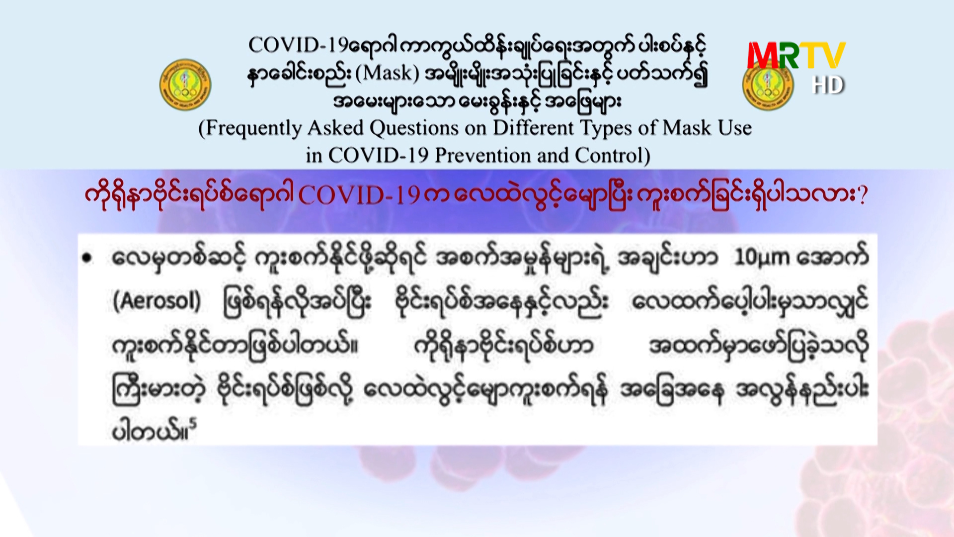 အနောက်ပိုးကရင်ဘာသာ“COVID-19 ရောဂါကာကွယ်ထိန်းချုပ်ရေးအတွက် ပါးစပ်နှင့်နှာခေါင်းစည်း(Mask) အမျိုးမျိုးအသုံးပြုခြင်းနှင့် ပတ်သက်၍အမေးများ သောမေးခွန်းနှင့်အဖြေများ” Monday, April 20, 2020 Monday, April 20, 2020