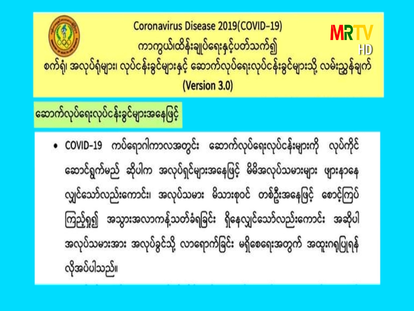 “မွန်ဘာသာ” Coronavirus Disease 2019 (COVID-19) ကာကွယ်၊ ထိန်းချုပ်ရေးနှင့်ပတ်သက်၍ စက်ရုံ၊ အလုပ်ရုံများ၊ လုပ်ငန်းခွင်များနှင့် ဆောက်လုပ်ရေးလုပ်ငန်းခွင်များသို့ လမ်းညွှန်ချက် (version 3.0) (ဆောက်လုပ်ရေးလုပ်ငန်းခွင်များအနေဖြင့်) Saturday, May 02, 2020 Saturday, May 02, 2020
