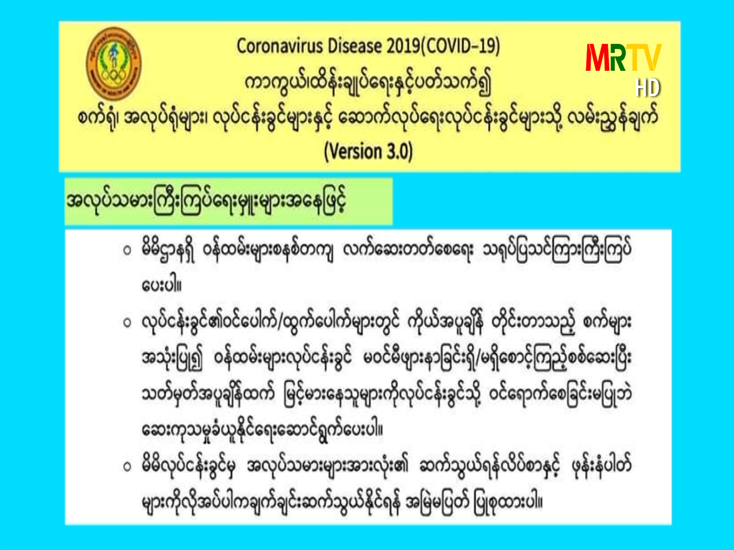 “ရခိုင်ဘာသာ” Coronavirus Disease 2019 (COVID-19) ကာကွယ်၊ ထိန်းချုပ်ရေးနှင့်ပတ်သက်၍ စက်ရုံ၊ အလုပ်ရုံများ၊ လုပ်ငန်းခွင်များနှင့် ဆောက်လုပ်ရေးလုပ်ငန်းခွင်များသို့ လမ်းညွှန်ချက် Sunday, May 03, 2020 Sunday, May 03, 2020