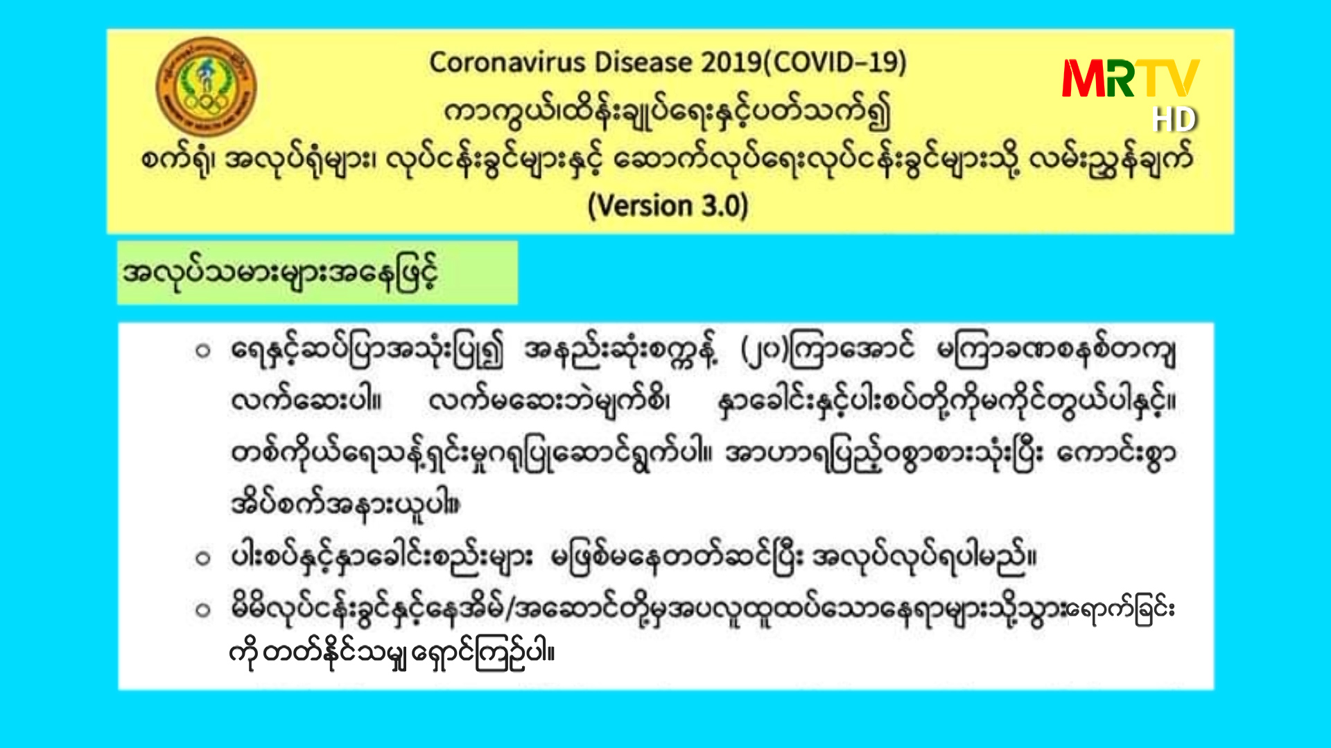 “ဝ ဘာသာ” Coronavirus Disease 2019 (COVID-19) ကာကွယ်၊ ထိန်းချုပ်ရေးနှင့်ပတ်သက်၍ စက်ရုံ၊ အလုပ်ရုံများ၊ လုပ်ငန်းခွင်များနှင့် ဆောက်လုပ်ရေးလုပ်ငန်းခွင်များသို့ လမ်းညွှန်ချက် (version 3.0) (အလုပ်သမားများအနေဖြင့်) Monday, May 04, 2020 Monday, May 04, 2020