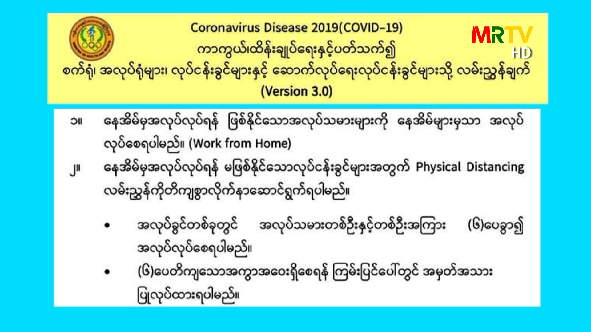 “မွန်ဘာသာ” Coronavirus Disease 2019 (COVID-19) ကာကွယ်၊ ထိန်းချုပ်ရေးနှင့်ပတ်သက်၍ စက်ရုံ၊ အလုပ်ရုံများ၊ လုပ်ငန်းခွင်များနှင့် ဆောက်လုပ်ရေးလုပ်ငန်းခွင်များသို့ လမ်းညွှန်ချက် (version 3.0) Monday, May 04, 2020 Monday, May 04, 2020