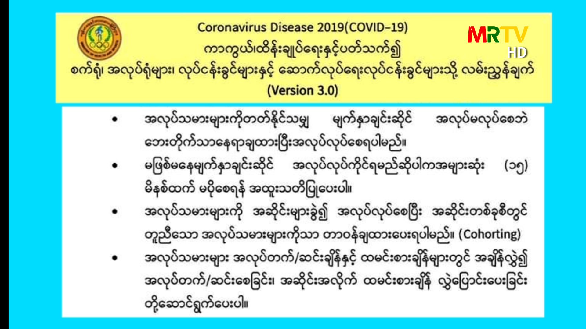 “ကယားဘာသာ” Coronavirus Disease 2019 (COVID-19) ကာကွယ်၊ ထိန်းချုပ်ရေးနှင့်ပတ်သက်၍ စက်ရုံ၊ အလုပ်ရုံများ၊ လုပ်ငန်းခွင်များနှင့် ဆောက်လုပ်ရေးလုပ်ငန်းခွင်များသို့ လမ်းညွှန်ချက် (version 3.0) Monday, May 04, 2020 Monday, May 04, 2020