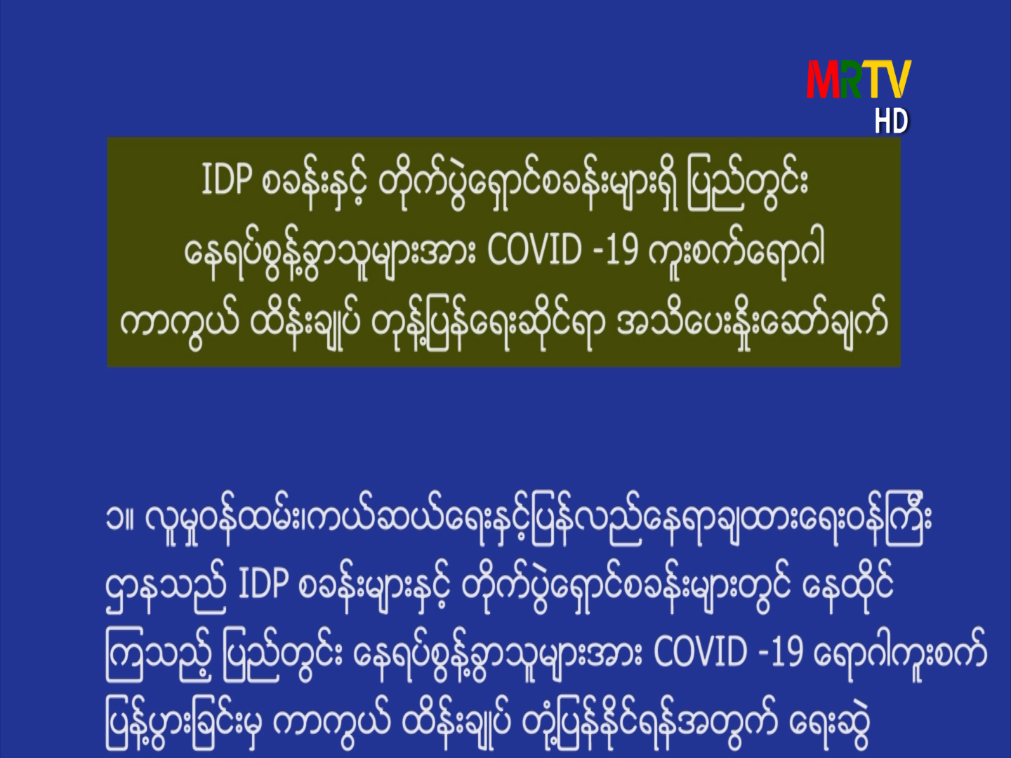 (အရှေ့ပိုးကရင် ဘာသာ) IDP စခန်းနှင့် တိုက်ပွဲရှောင်စခန်းများရှိ ပြည်တွင်း နေရပ်စွန့်ခွာသူများအား COVID – 19 ကူးစက်ရောဂါကာကွယ် ထိန်းချုပ်တုံ့ပြန်ရေးဆိုင်ရာ အသိပေးနှိုးဆော်ချက် Sunday, May 10, 2020 Sunday, May 10, 2020