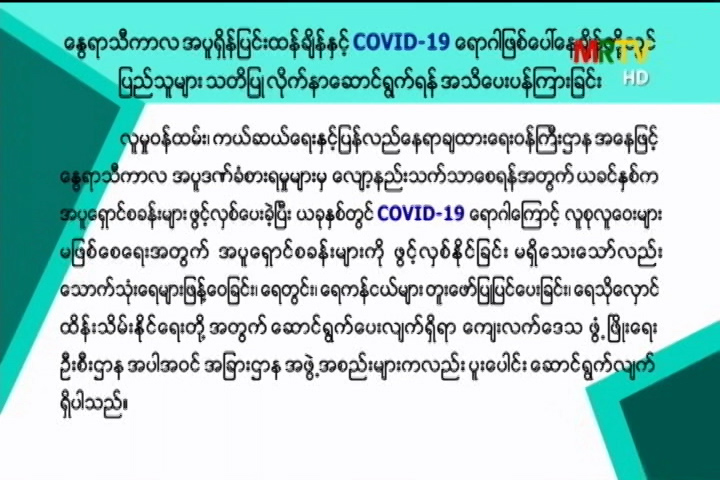 နွေရာသီကာလ အပူရှိန်ပြင်းထန်ချိန်နှင့် COVID-19 ရောဂါဖြစ်ပေါ်နေချိန်တို့တွင် ပြည်သူများ သတိပြုလိုက်နာဆောင်ရွက်ရန် အသိပေးပန်ကြားခြင်း Sunday, May 17, 2020 Sunday, May 17, 2020