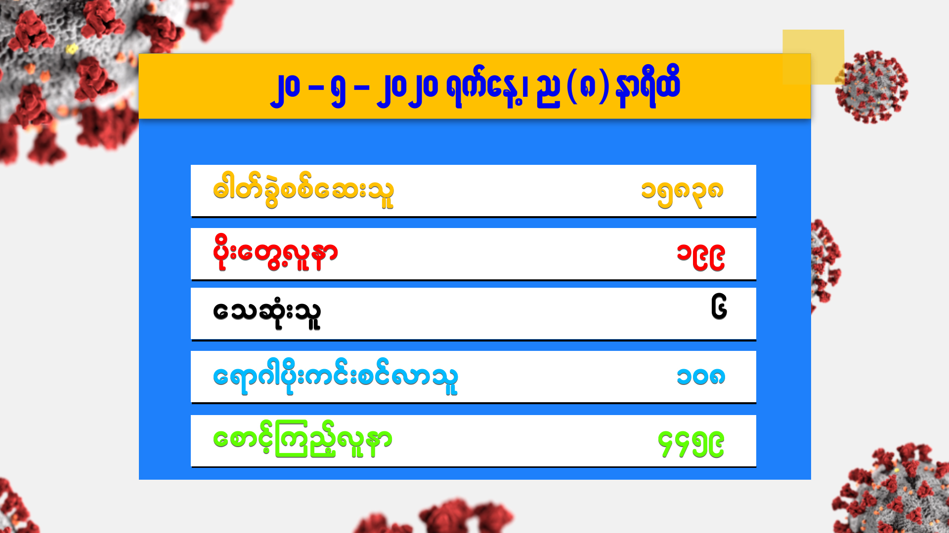 မြန်မာနိုင်ငံအတွင်း ကိုရိုနာဗိုင်းရပ်စ် စောင့်ကြပ်ကြည့်ရှုမှု အခြေအနေ (၂၀-၅-၂၀၂၀ ရက်နေ့၊ ည (၈)နာရီ)