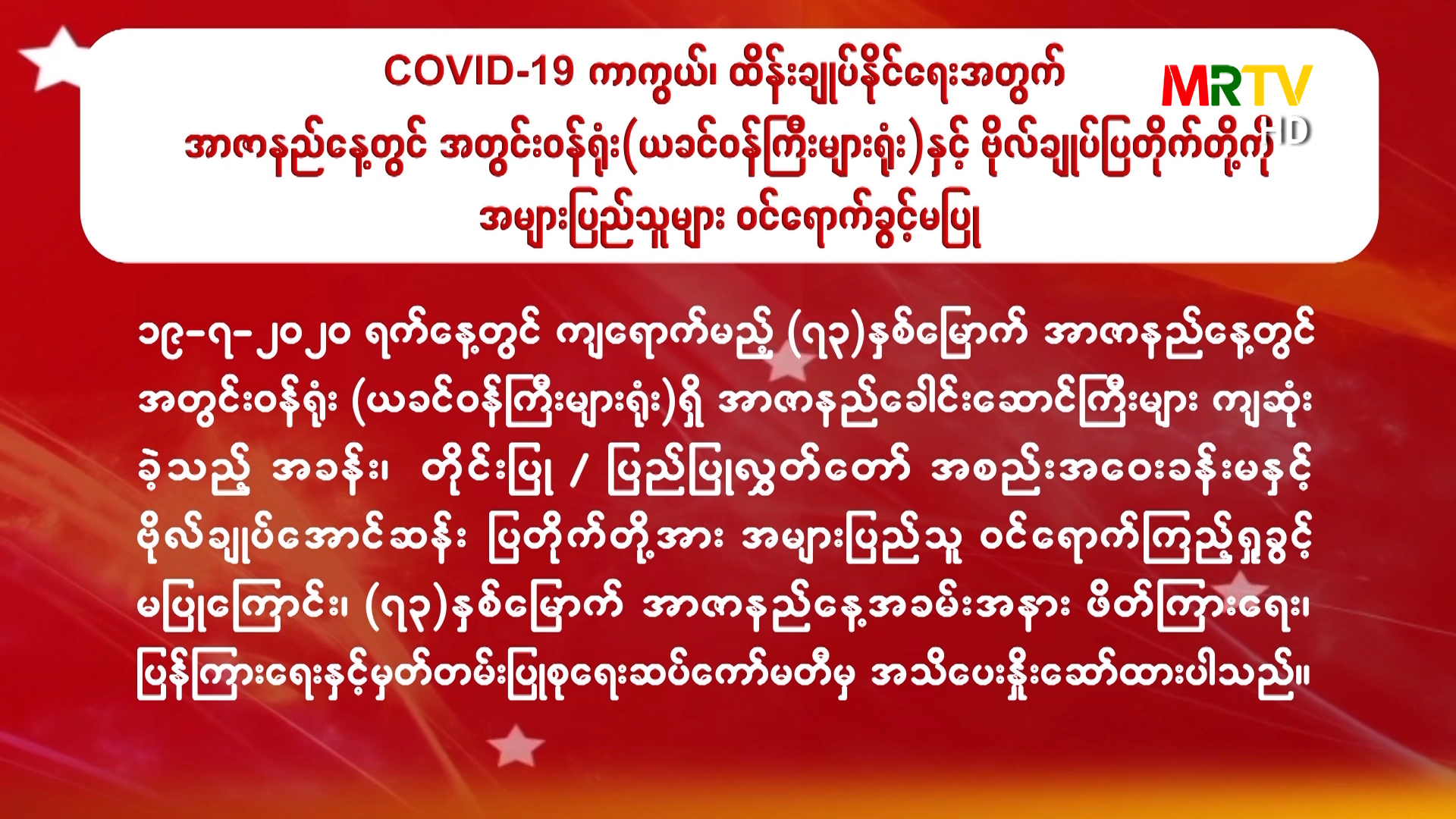 COVID-19 ကာကွယ်၊ ထိန်းချုပ်နိုင်ရေးအတွက် အာဇာနည်နေ့တွင် အတွင်းဝန်ရုံး (ယခင်ဝန်ကြီးများရုံး)နှင့် ဗိုလ်ချုပ်ပြတိုက်တို့ကို အများပြည်သူများ ဝင်ရောက်ခွင့်မပြု