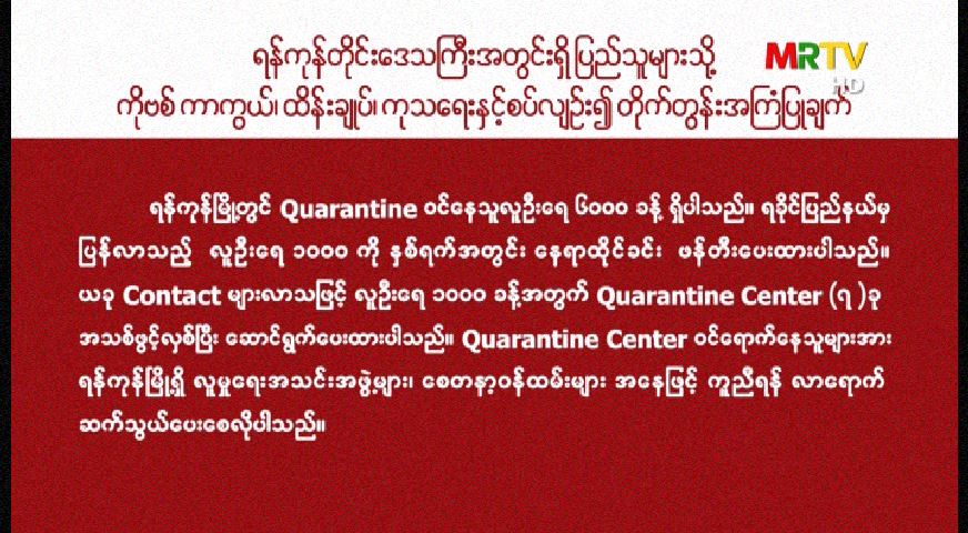 ရန်ကုန်တိုင်းဒေသကြီးအတွင်းရှိ ပြည်သူများသို့ ကိုဗစ် ကာကွယ်၊ ထိန်းချုပ်၊ ကုသရေးနှင့် စပ်လျဉ်း၍ တိုက်တွန်းအကြံပြုချက် Tuesday, September 08, 2020 Tuesday, September 08, 2020