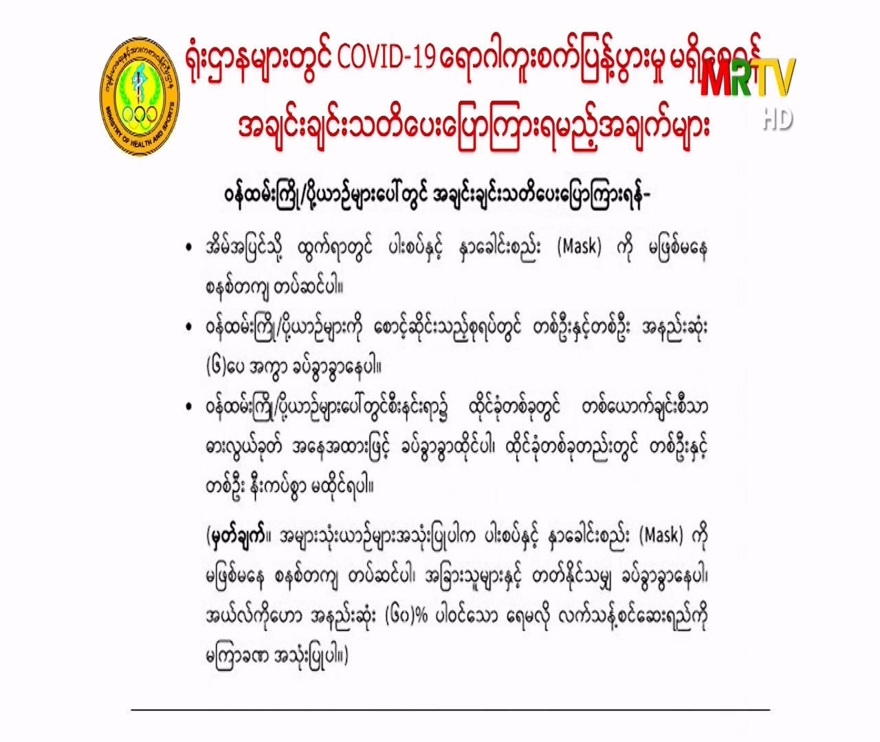 ရုံးဌာနများတွင် COVID-19 ရောဂါကူးစက်ပြန့်ပွားမှု မရှိစေရန် အချင်းချင်းသတိပေးပြောကြားရမည့်အချက်များ Saturday, September 19, 2020 COVID-19 Saturday, September 19, 2020