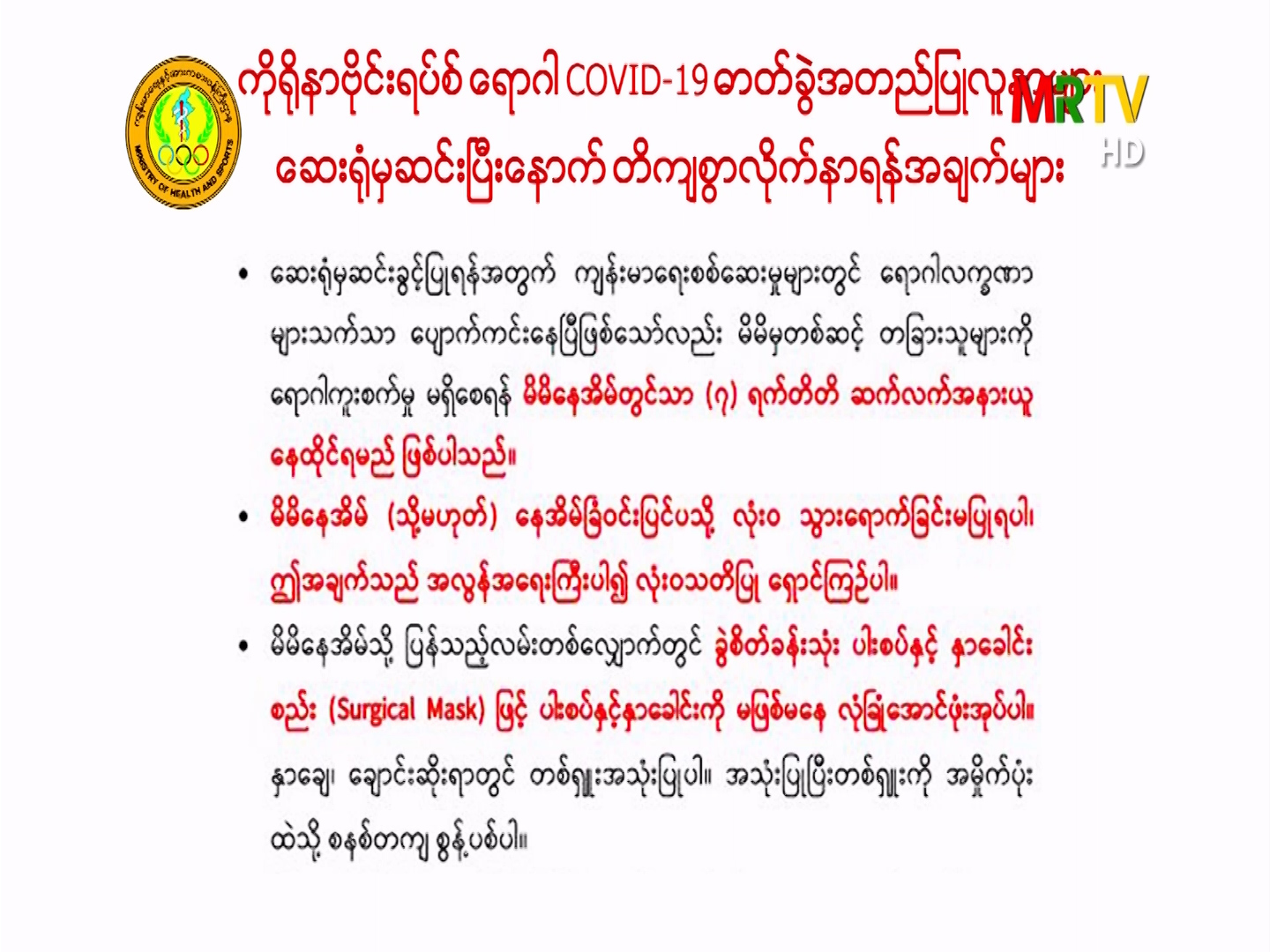 ကိုရိုနာဗိုင်းရပ်စ်ရောဂါ COVID-19 ဓါတ်ခွဲအတည်ပြုလူနာများ ဆေးရုံမှ ဆင်းပြီးနောက် တိကျစွာ လိုက်နာရန်အချက်များ Monday, September 28, 2020 Monday, September 28, 2020
