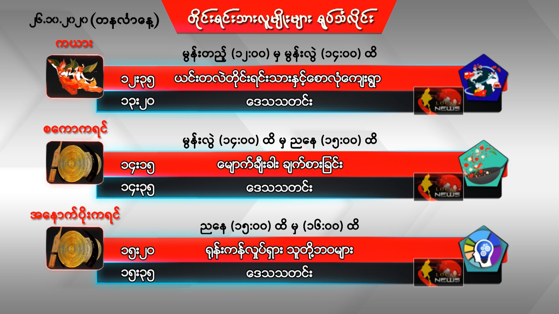 (၂၆-၁၀-၂၀၂၀) ရက်နေ့ တိုင်းရင်းသားရုပ်သံလိုင်းထုတ်လွှင့်မှုအစီအစဉ်များ Monday, October 26, 2020 Monday, October 26, 2020