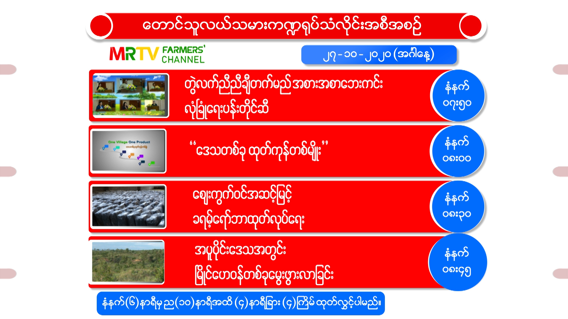 (၂၇-၁၀-၂၀၂၀) ရက်နေ့ တောင်သူလယ်သမားကဏ္ဍရုပ်သံလိုင်းထုတ်လွှင့်မှုအစီအစဉ်များ Tuesday, October 27, 2020 Tuesday, October 27, 2020