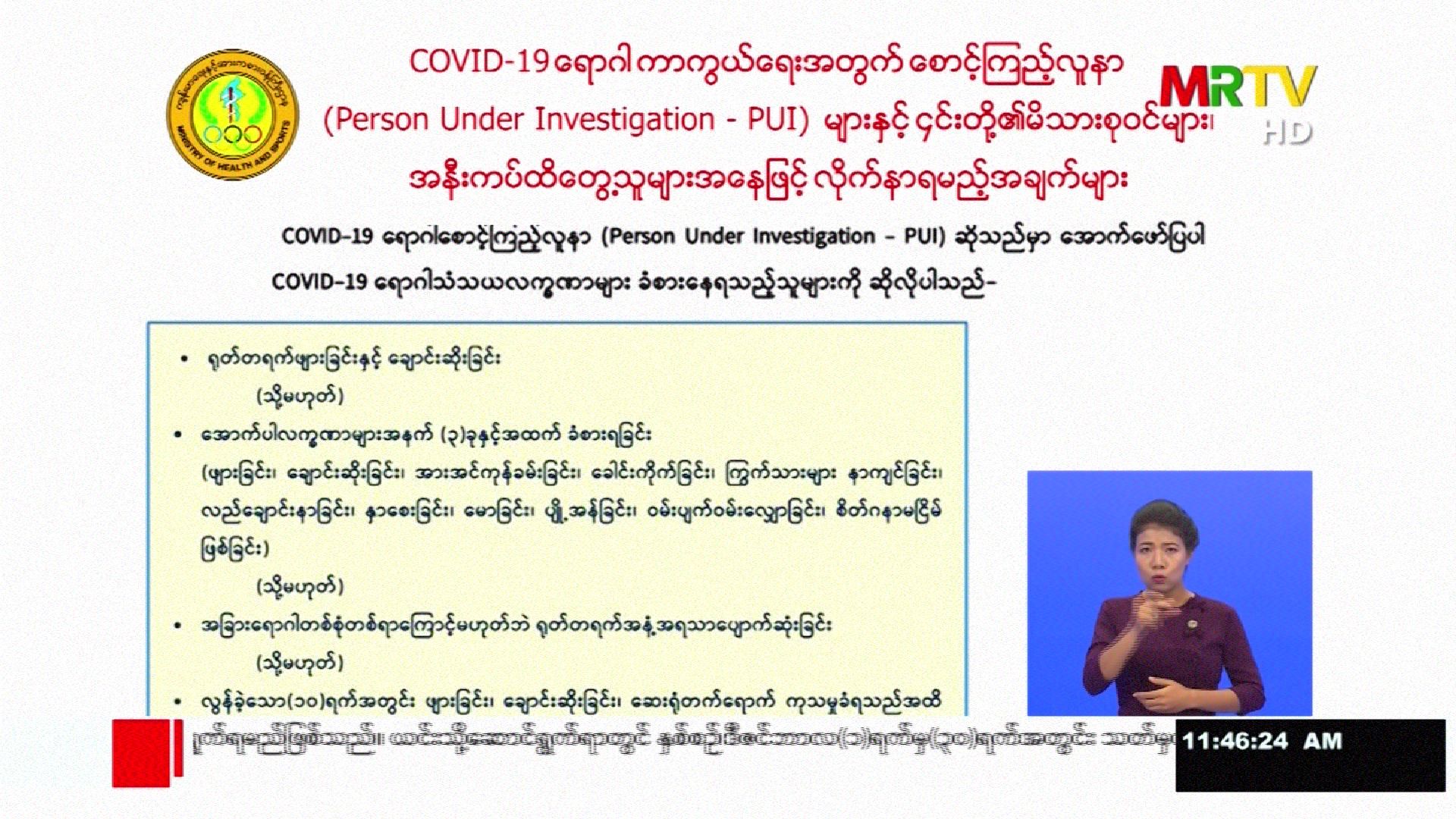 COVID-19 ရောဂါကာကွယ်ရေးအတွက် စောင့်ကြည့်လူနာ (Person Under Investigation - PUI)များနှင့် ၎င်းတို့၏ မိသားစုဝင်များ၊ အနီးကပ်ထိတွေ့သူများအနေဖြင့် လိုက်နာရမည့်အချက်များ Wednesday, November 04, 2020 Wednesday, November 04, 2020