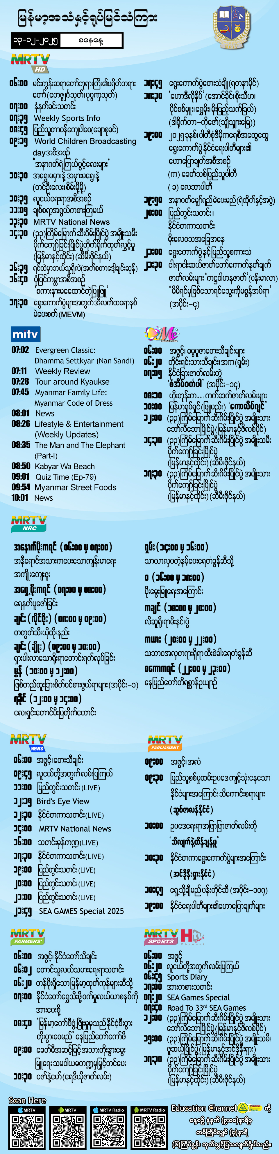 ၁၃-၁၂-၂၀၂၅ ရက်နေ့တွင် ထုတ်လွှင့်ပြသမည့် အစီအစဉ်များ