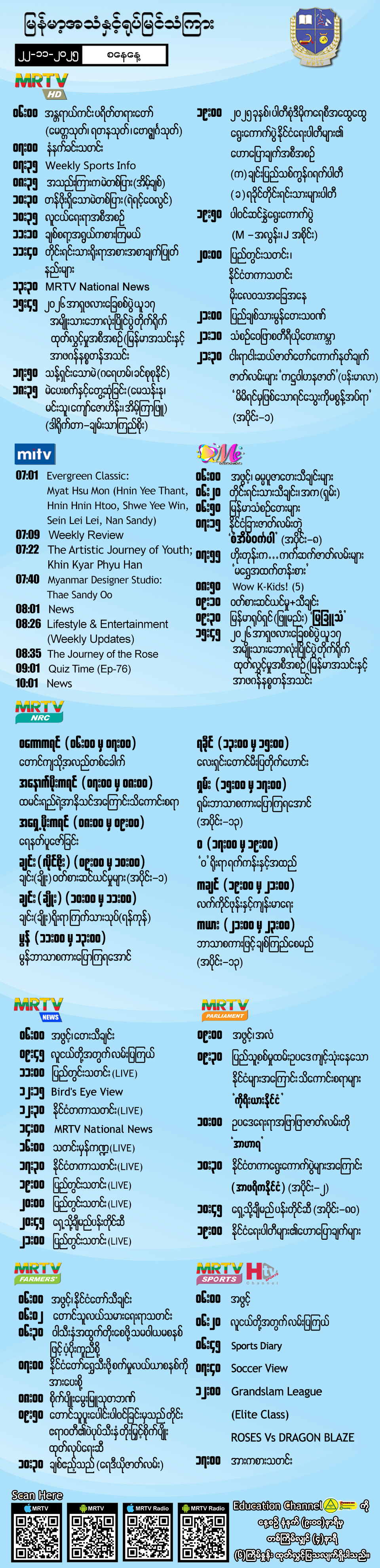 ၂၂-၁၁-၂၀၂၅ ရက်နေ့တွင် ထုတ်လွှင့်ပြသမည့် အစီအစဉ်များ