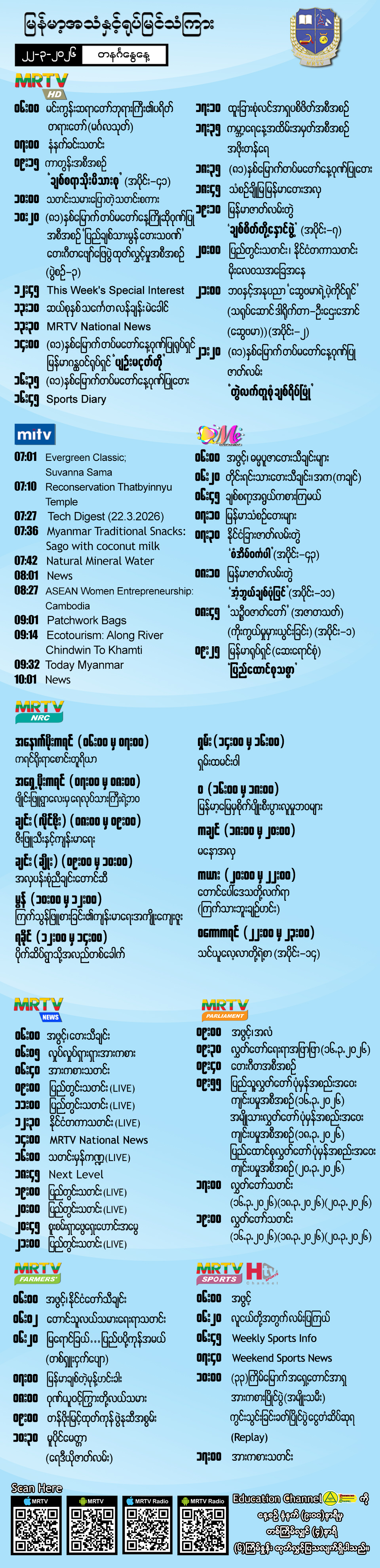 ၂၂-၃-၂၀၂၆ ရက်နေ့တွင် ထုတ်လွှင့်ပြသမည့် အစီအစဉ်များ