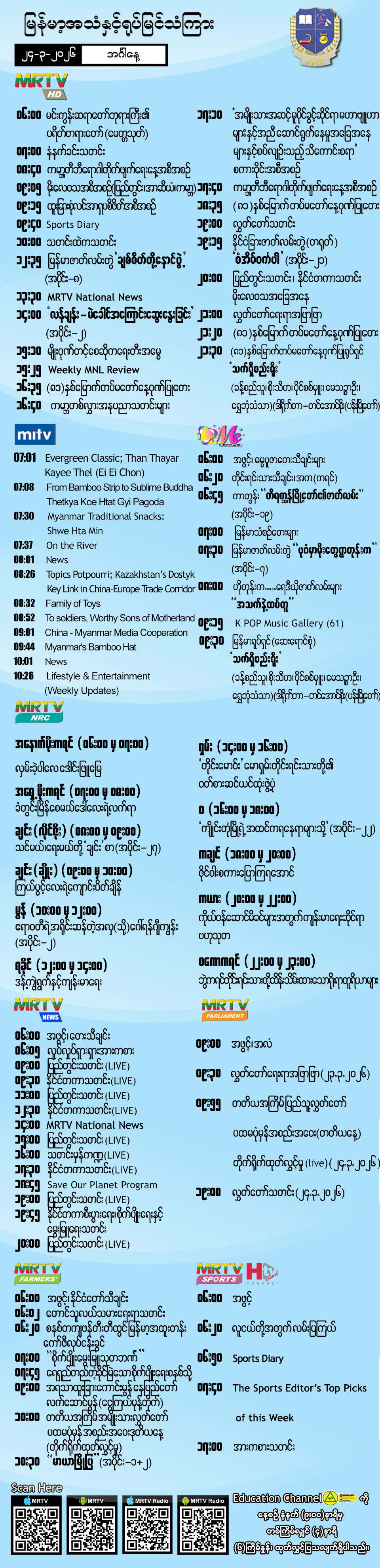 ၂၄-၃-၂၀၂၆ ရက်နေ့တွင် ထုတ်လွှင့်ပြသမည့် အစီအစဉ်များ