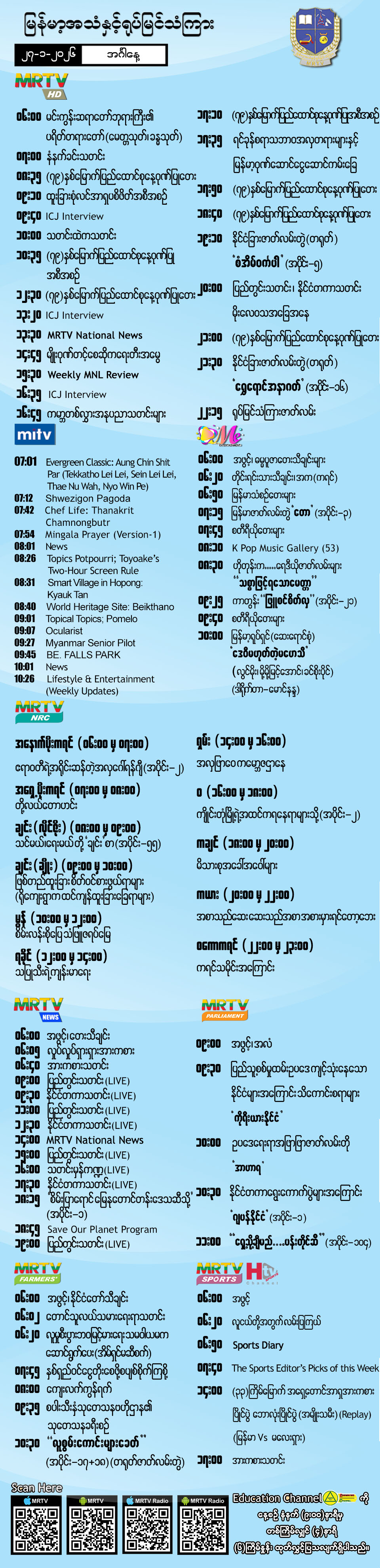 ၂၇-၁-၂၀၂၆ ရက်နေ့တွင် ထုတ်လွှင့်ပြသမည့် အစီအစဉ်များ
