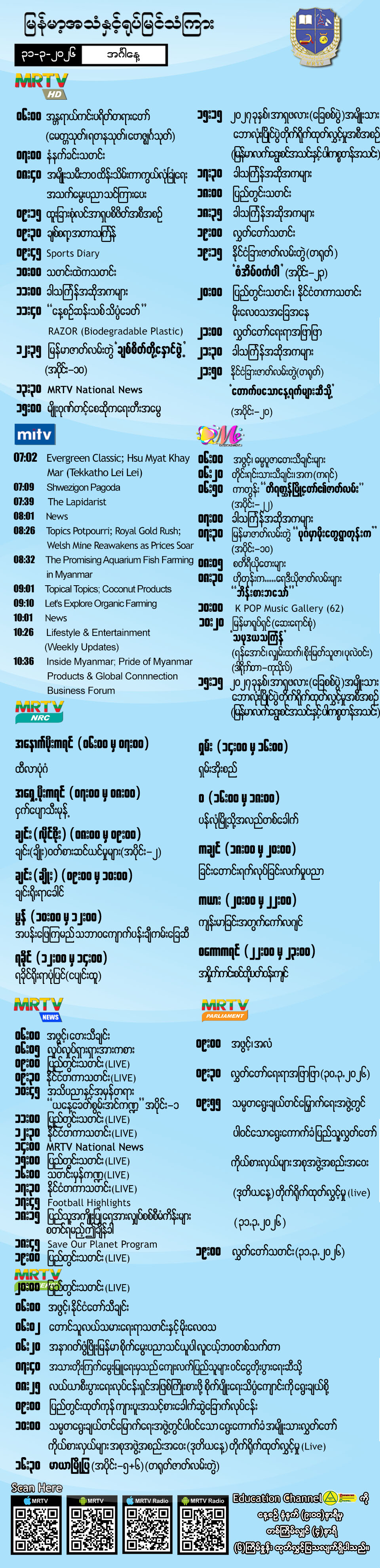 ၃၁-၃-၂၀၂၆ ရက်နေ့တွင် ထုတ်လွှင့်ပြသမည့် အစီအစဉ်များ