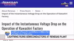 ဂျပန်နိုင်ငံတွင် အင်္ဂါနေ့ မနက်က ကူမာမိုတိုစီရင်စု၊ ကာဝါရှီရီရှိ စက်ရုံက လျှပ်စစ်ကြိုးတစ်ခု အားမိုးကြိုးပစ်ခံခဲ့ရ