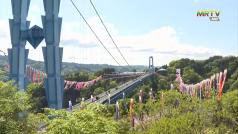 မေလ (၅)ရက်နေ့တွင် ကျရောက်လေ့ရှိသည့် ကလေးသူငယ်များနေ့အတွက် တိုကျို၏ အရှေ့မြောက်ပိုင်း Ibaraki ပြည်နယ် တံတားတွင် windsock တစ်ထောင်ကျော်ကို ချိတ်ဆွဲထား