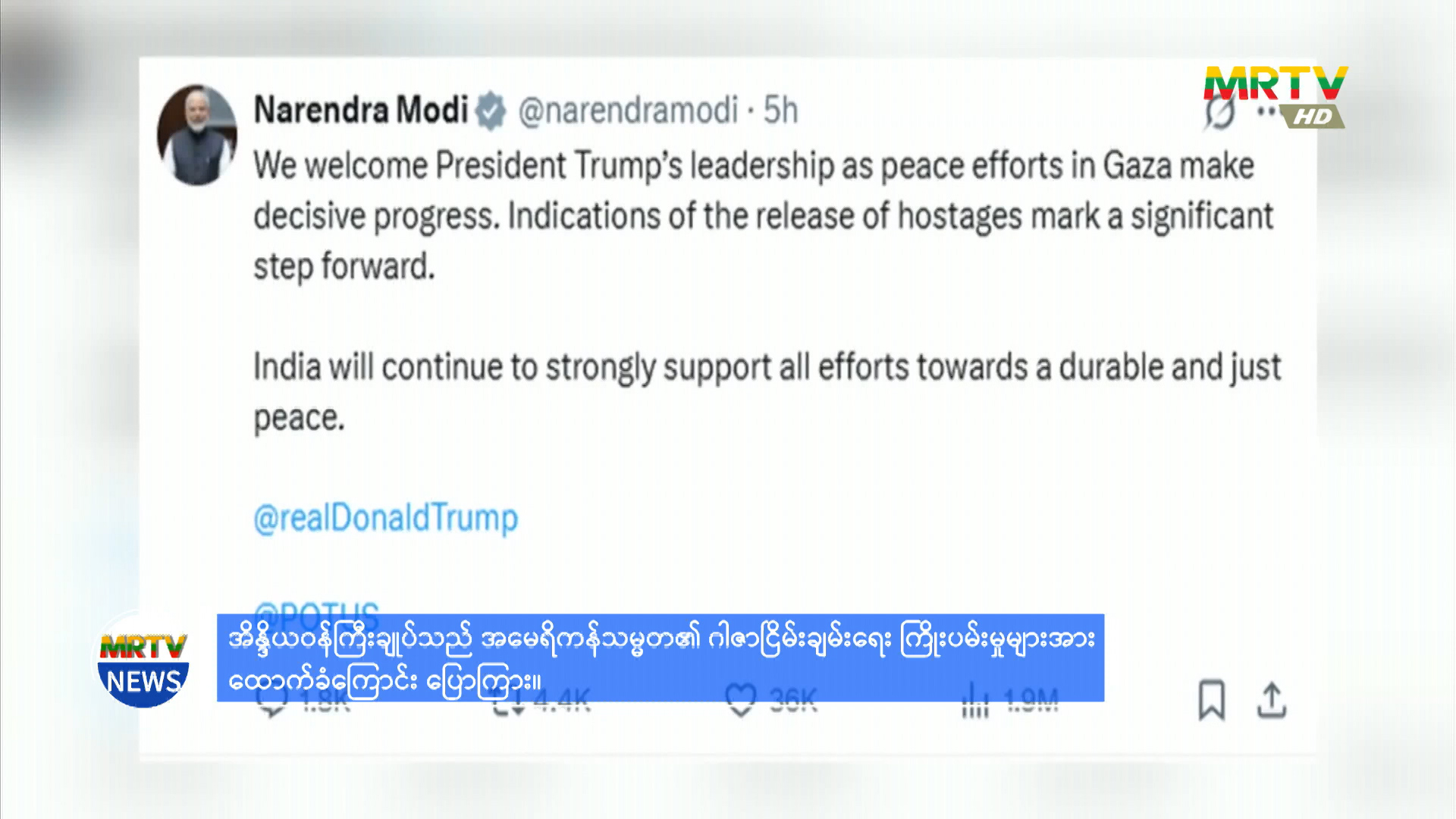 အိန္ဒိယဝန်ကြီးချုပ်သည် အမေရိကန်သမ္မတ၏ ဂါဇာငြိမ်းချမ်းရေး ကြိုးပမ်းမှုများအား ထော…