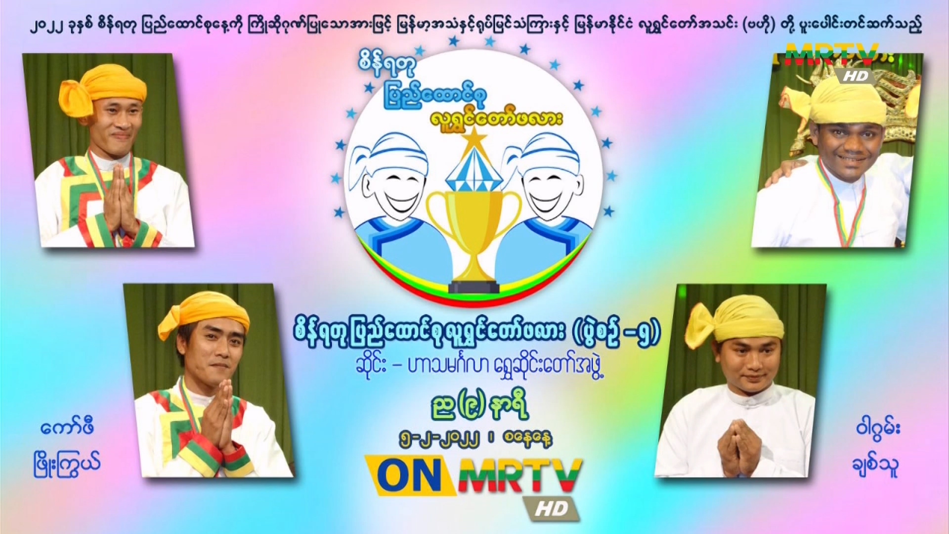 "စိန်ရတုပြည်ထောင်စု လူရွှင်တော်ဖလား" ပြိုင်ပွဲ ပွဲစဉ်(၅)အား မြန်မာ့အသံနှင့်ရုပ်မြင်သံကြား၌ ပြသမည် စနေနေ့, ဖေဖေါ်ဝါရီလ 05, 2022 စနေနေ့, ဖေဖေါ်ဝါရီလ 05, 2022