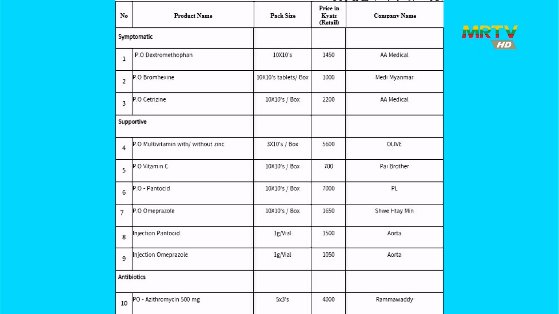 ကိုဗစ်-၁၉ ရောဂါအား ကာကွယ်ထိန်းချုပ်ကုသရာတွင် အသုံးများသည့်ဆေးဝါးများ၏ ဖေဖော်ဝါရီလ (၃) ရက်၊ ညနေ (၆) နာရီအချိန်အထိ ပေါက်ဈေးနှုန်းများ တနင်္ဂနွေနေ့, ဖေဖေါ်ဝါရီလ 06, 2022 တနင်္ဂနွေနေ့, ဖေဖေါ်ဝါရီလ 06, 2022