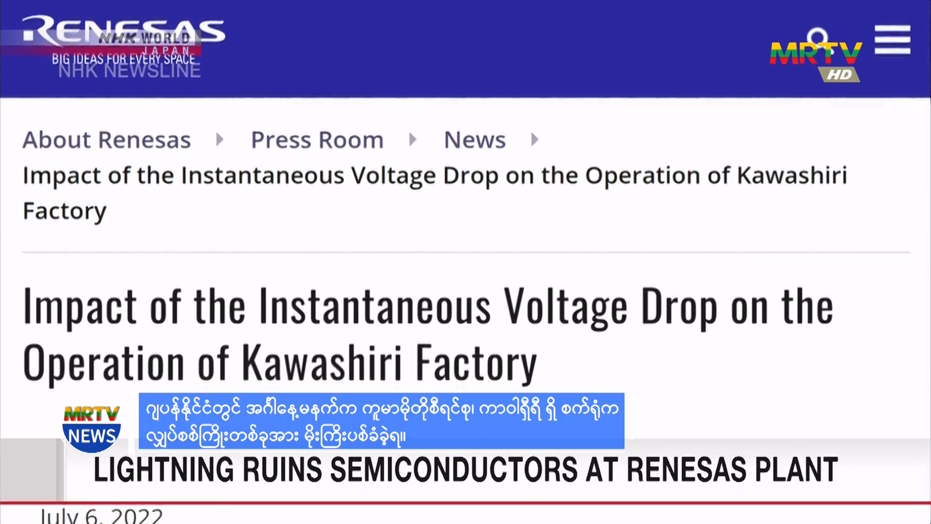 ဂျပန်နိုင်ငံတွင် အင်္ဂါနေ့ မနက်က ကူမာမိုတိုစီရင်စု၊ ကာဝါရှီရီရှိ စက်ရုံက လျှပ်စစ်ကြိုးတစ်ခု အားမိုးကြိုးပစ်ခံခဲ့ရ သောကြာနေ့, ဇူလိုင်လ 08, 2022 သောကြာနေ့, ဇူလိုင်လ 08, 2022