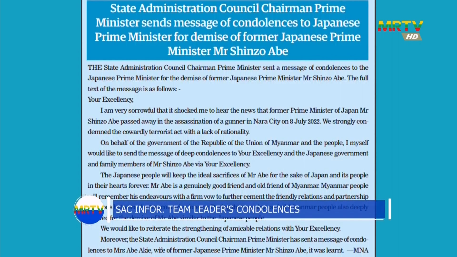 Mr Shinzo Abe is a good friend of Myanmar as well as an old friend. So, we are very sorrowful to hear about that event. Myanmar strongly condemns terrorists and terrorist organizations which committed terror acts at home and abroad. The SAC Chairman Prime Minister has sent letters of condolences.