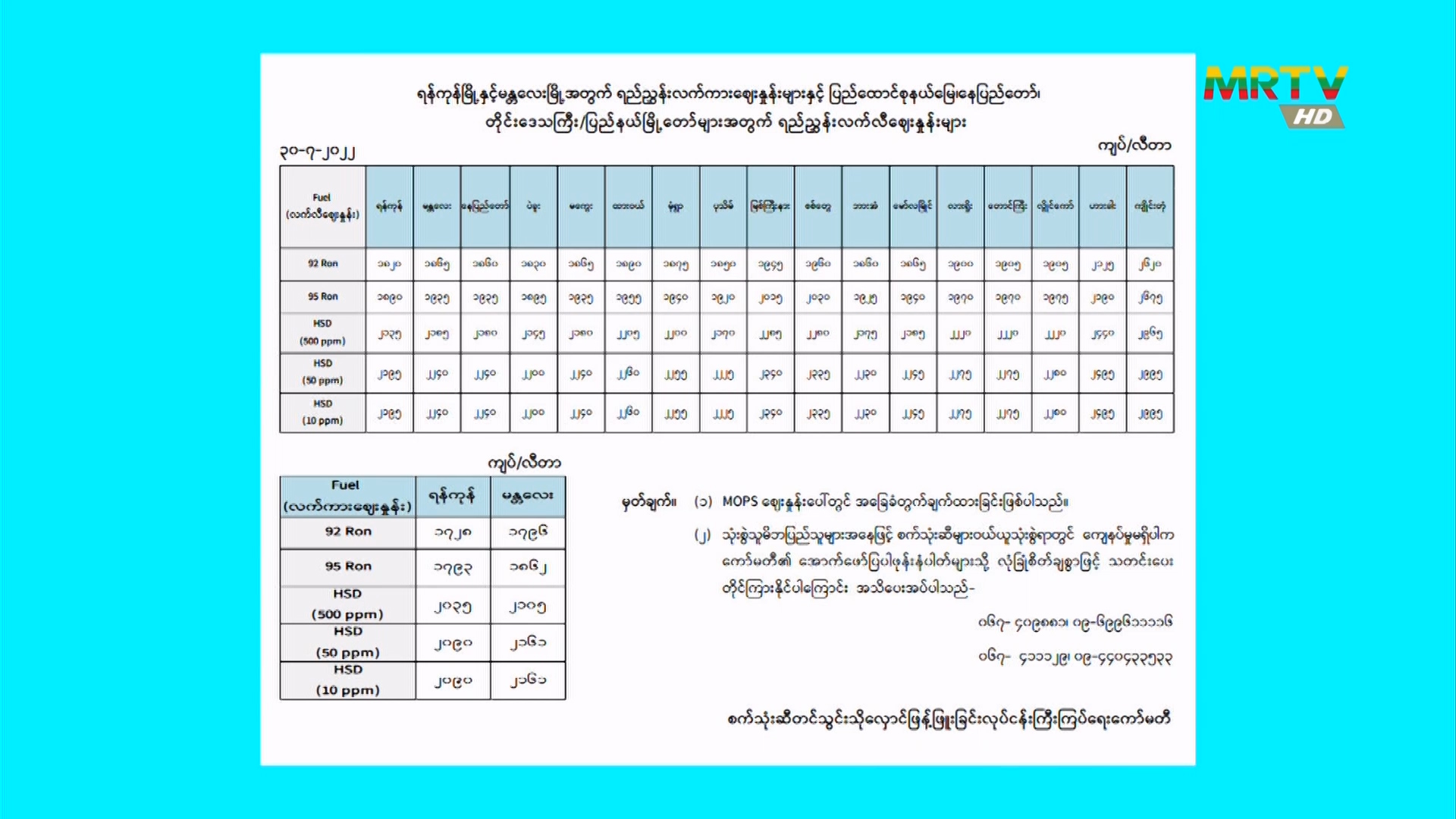 စက်သုံးဆီ တင်သွင်း/သိုလှောင်/ဖြန့်ဖြူးခြင်းလုပ်ငန်းကြီးကြပ်ရေးကော်မတီမှ တိုင်းဒေသကြီးနှင့် ပြည်နယ်အလိုက် စက်သုံးဆီရည်ညွှန်းဈေးနှုန်းများအား ဇူလိုင်လ ၃၀ ရက်နေ့တွင် ထုတ်ပြန်ကြေညာ