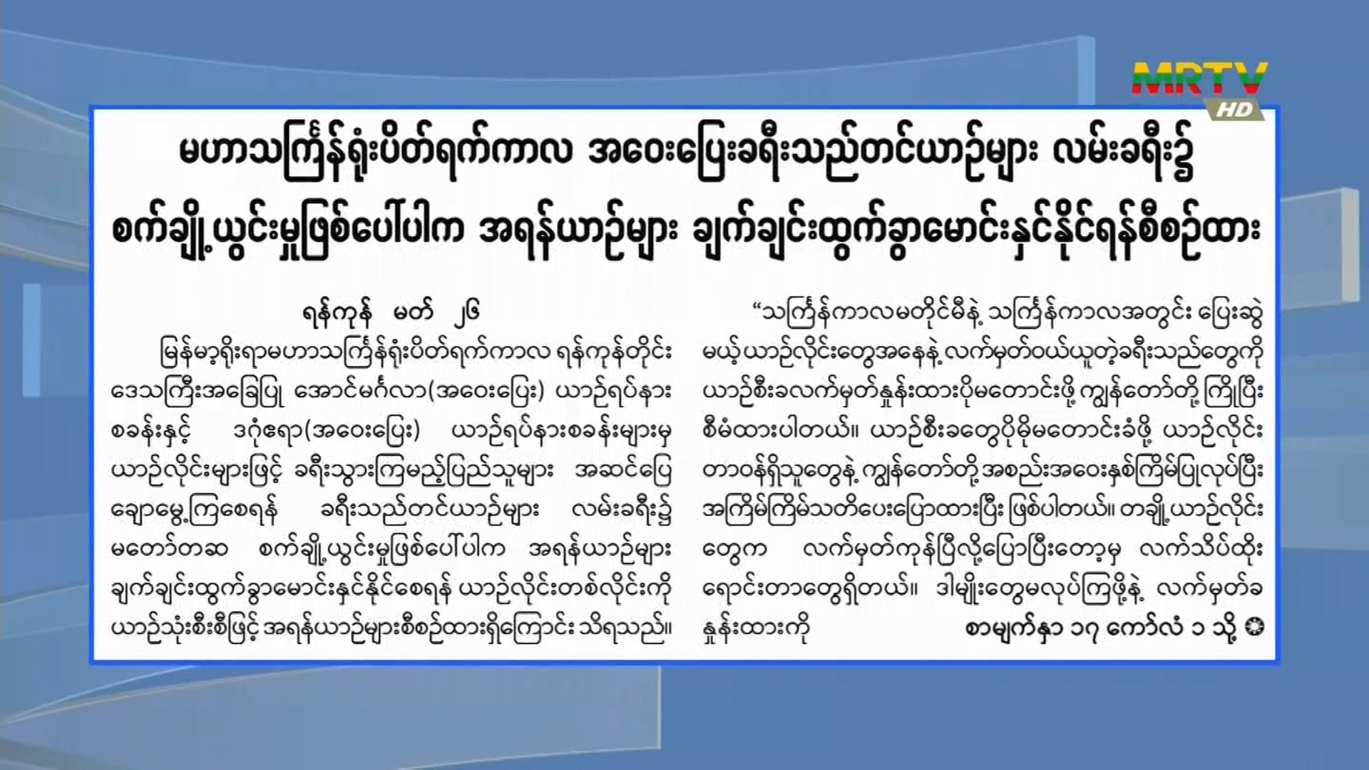 မဟာသင်္ကြန်ရုံးပိတ်ရက်ကာလ အဝေးပြေးခရီးသည်တင်ယာဉ်များ လမ်းခရီး၌ စက်ချို့ယွင်းမှုဖြစ်ပေါ်ပါက အရန်ယာဉ်များ ချက်ချင်းထွက်ခွာမောင်းနှင်နိုင်ရန် စီစဉ်ထား တနင်္လာနေ့, မတ်လ 27, 2023