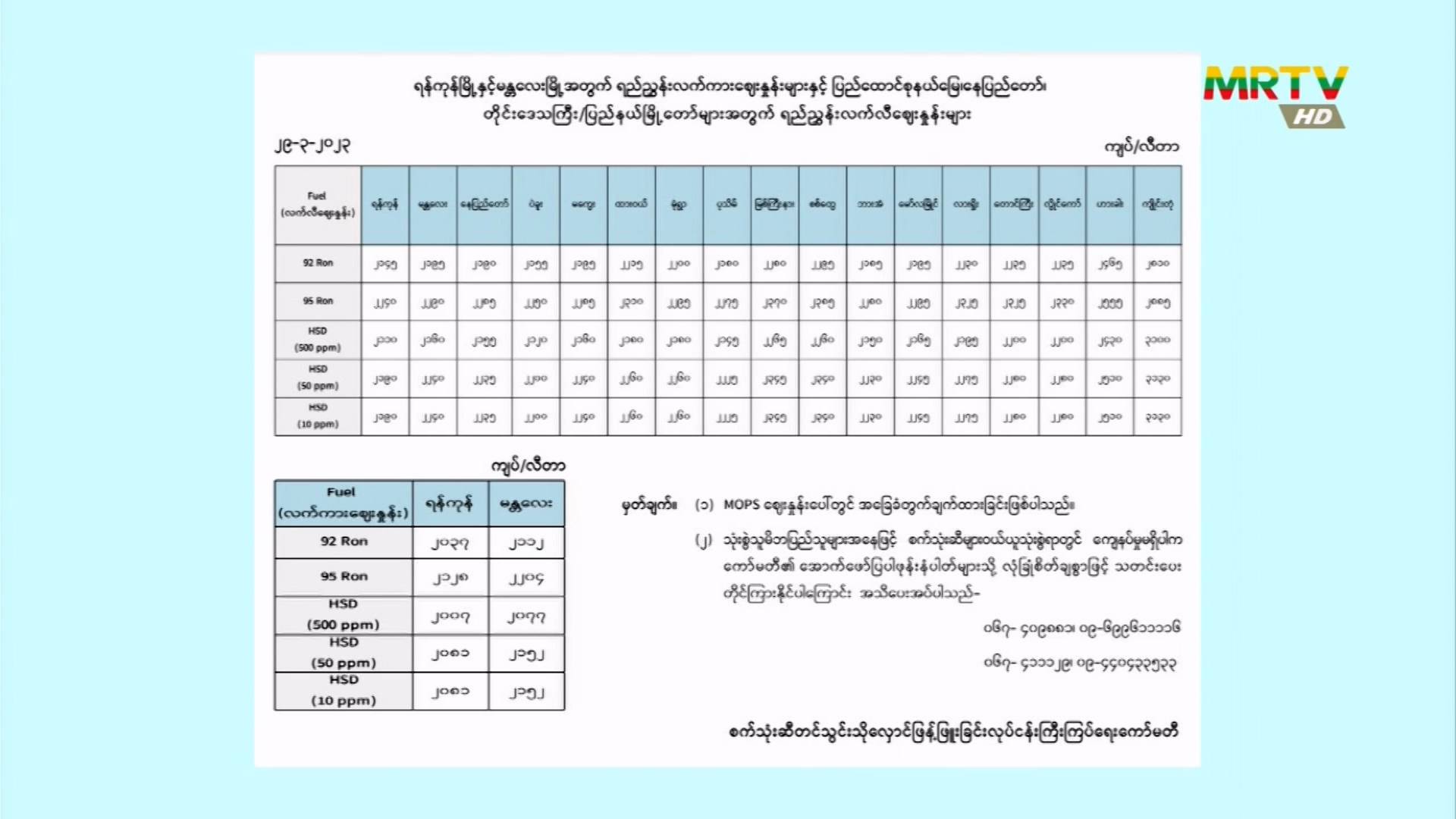 စက်သုံးဆီ တင်သွင်း/သိုလှောင်/ဖြန့်ဖြူးခြင်းလုပ်ငန်းကြီးကြပ်ရေးကော်မတီမှ တိုင်းဒေသကြီးနှင့် ပြည်နယ်အလိုက် စက်သုံးဆီရည်ညွှန်းဈေးနှုန်းများအား မတ်လ ၂၉ ရက်နေ့တွင် ထုတ်ပြန်ကြေညာ ဗုဒ္ဓဟူးနေ့, မတ်လ 29, 2023