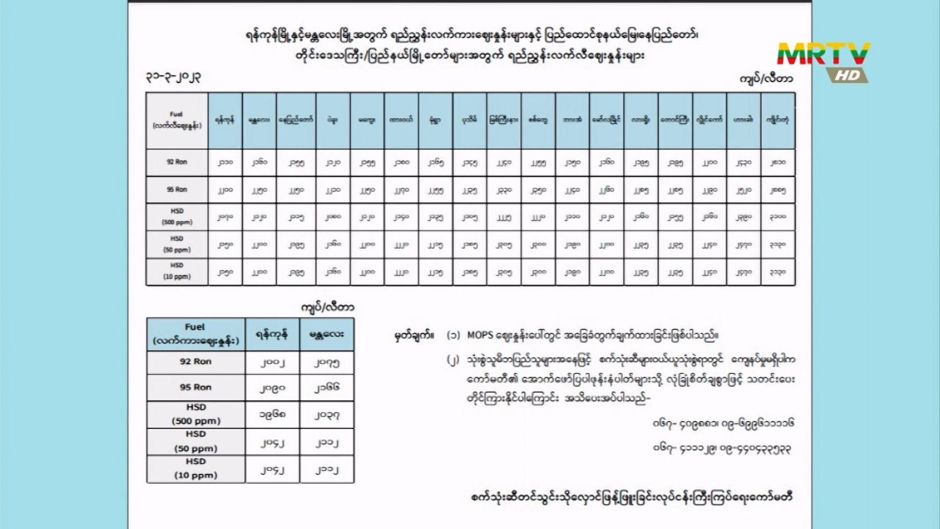 စက်သုံးဆီ တင်သွင်း/သိုလှောင်/ဖြန့်ဖြူးခြင်းလုပ်ငန်းကြီးကြပ်ရေးကော်မတီမှ တိုင်းဒေသကြီးနှင့် ပြည်နယ်အလိုက် စက်သုံးဆီရည်ညွှန်းဈေးနှုန်းများအား မတ်လ ၃၁ ရက်နေ့တွင် ထုတ်ပြန်ကြေညာ