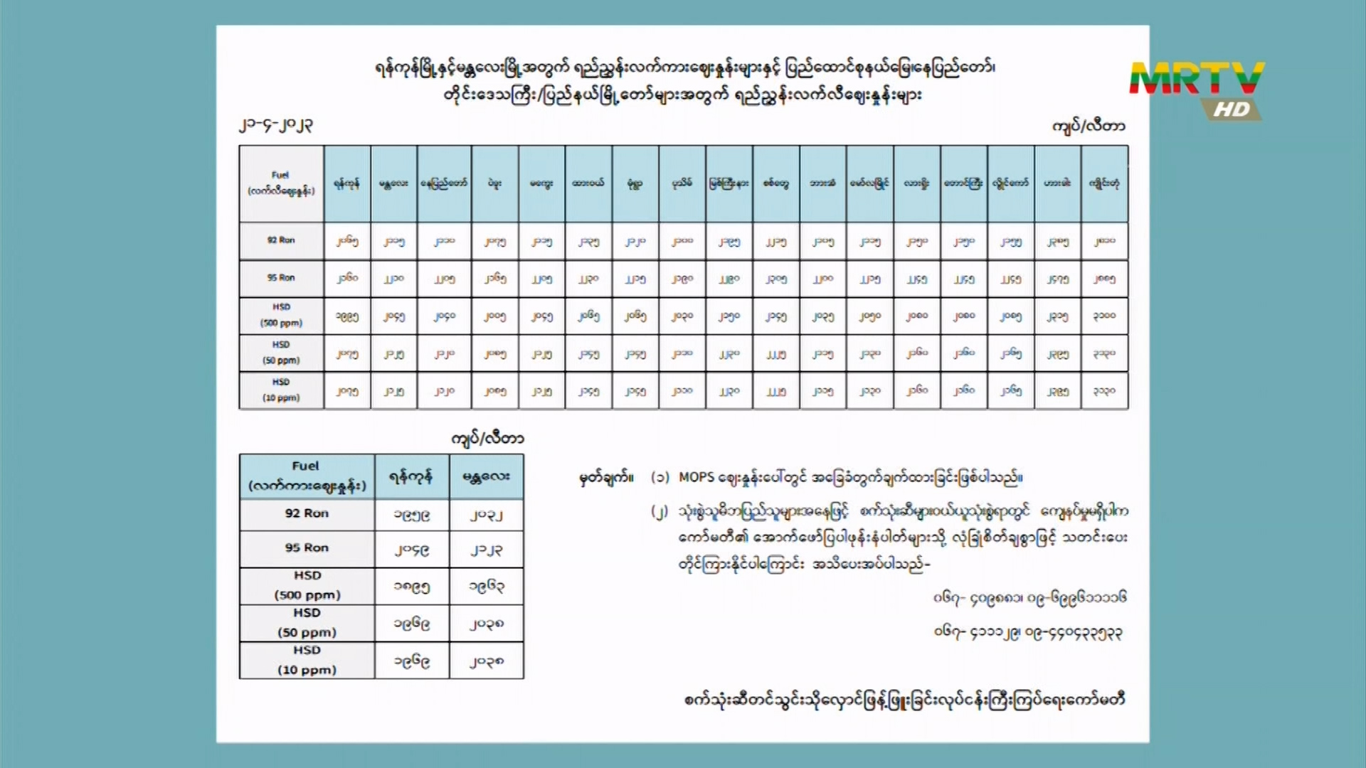 စက်သုံးဆီ တင်သွင်း/သိုလှောင်/ဖြန့်ဖြူးခြင်းလုပ်ငန်းကြီးကြပ်ရေးကော်မတီမှ တိုင်းဒေသကြီးနှင့် ပြည်နယ်အလိုက် စက်သုံးဆီရည်ညွှန်းဈေးနှုန်းများအား ဧပြီလ ၂၁ ရက်နေ့တွင် ထုတ်ပြန်ကြေညာ သောကြာနေ့, ဧပြီလ 21, 2023