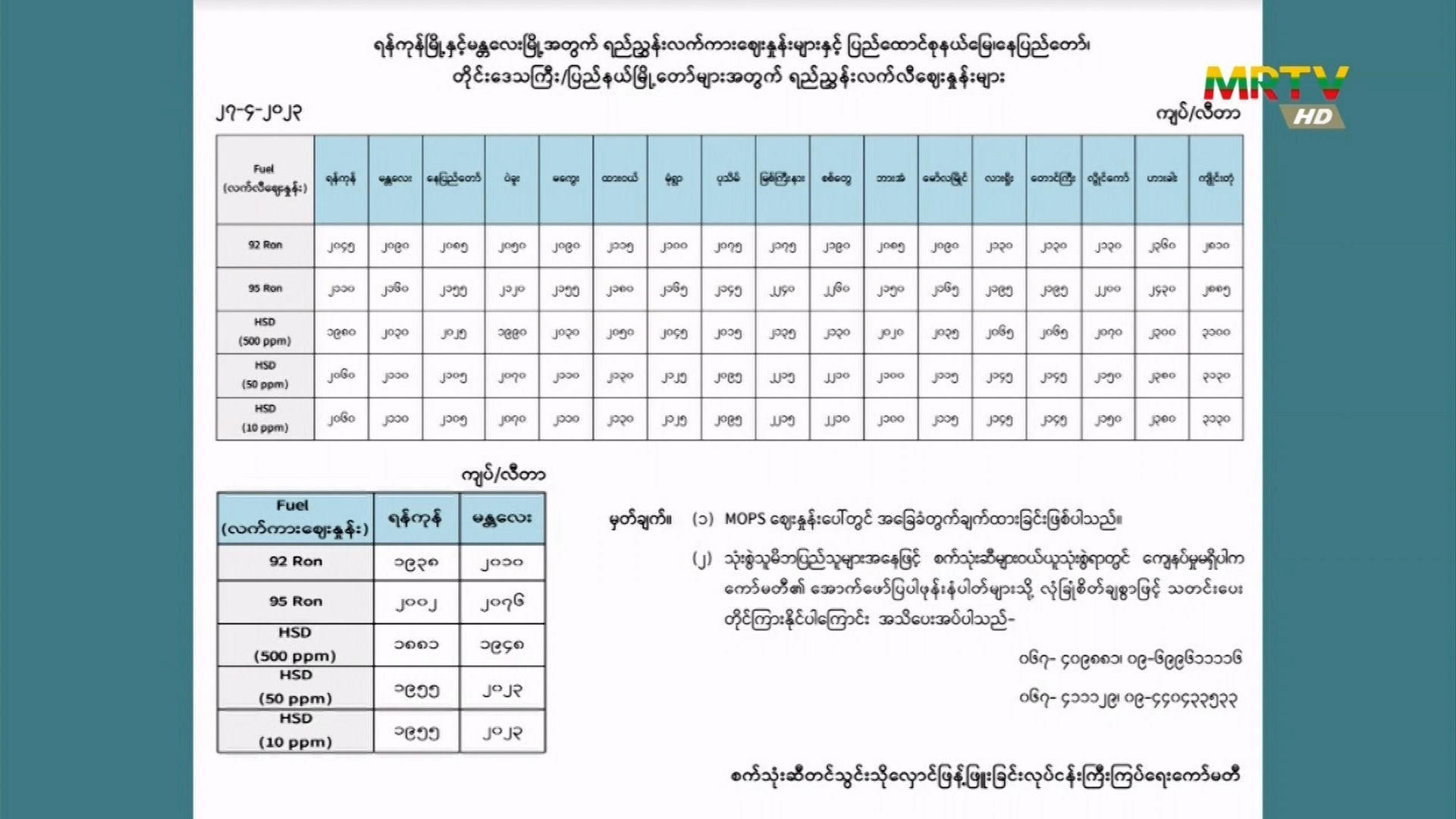 စက်သုံးဆီ တင်သွင်း/သိုလှောင်/ဖြန့်ဖြူးခြင်းလုပ်ငန်းကြီးကြပ်ရေးကော်မတီမှ တိုင်းဒေသကြီးနှင့် ပြည်နယ်အလိုက် စက်သုံးဆီရည်ညွှန်းဈေးနှုန်းများအား ဧပြီလ ၂၇ ရက်နေ့တွင် ထုတ်ပြန်ကြေညာ
